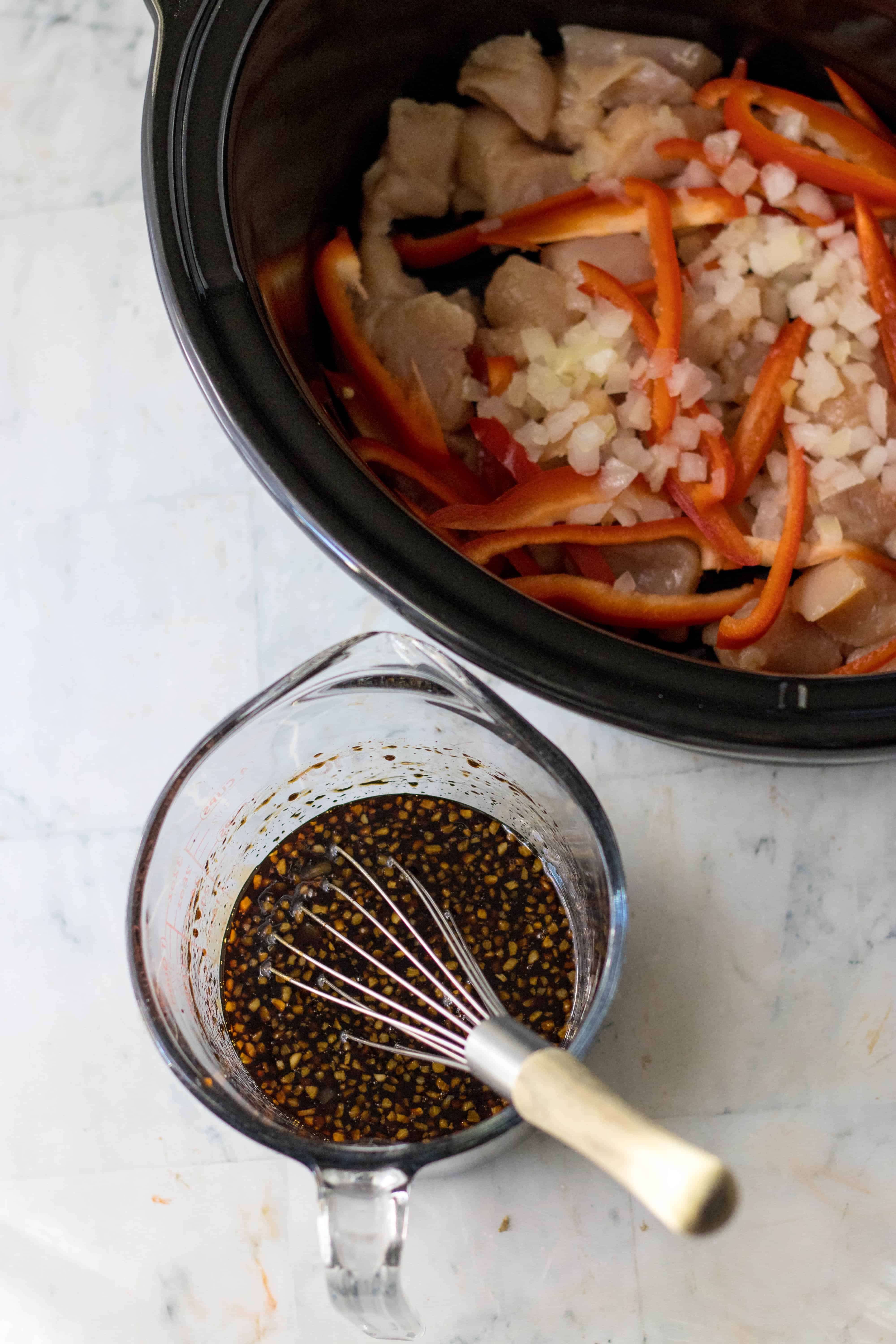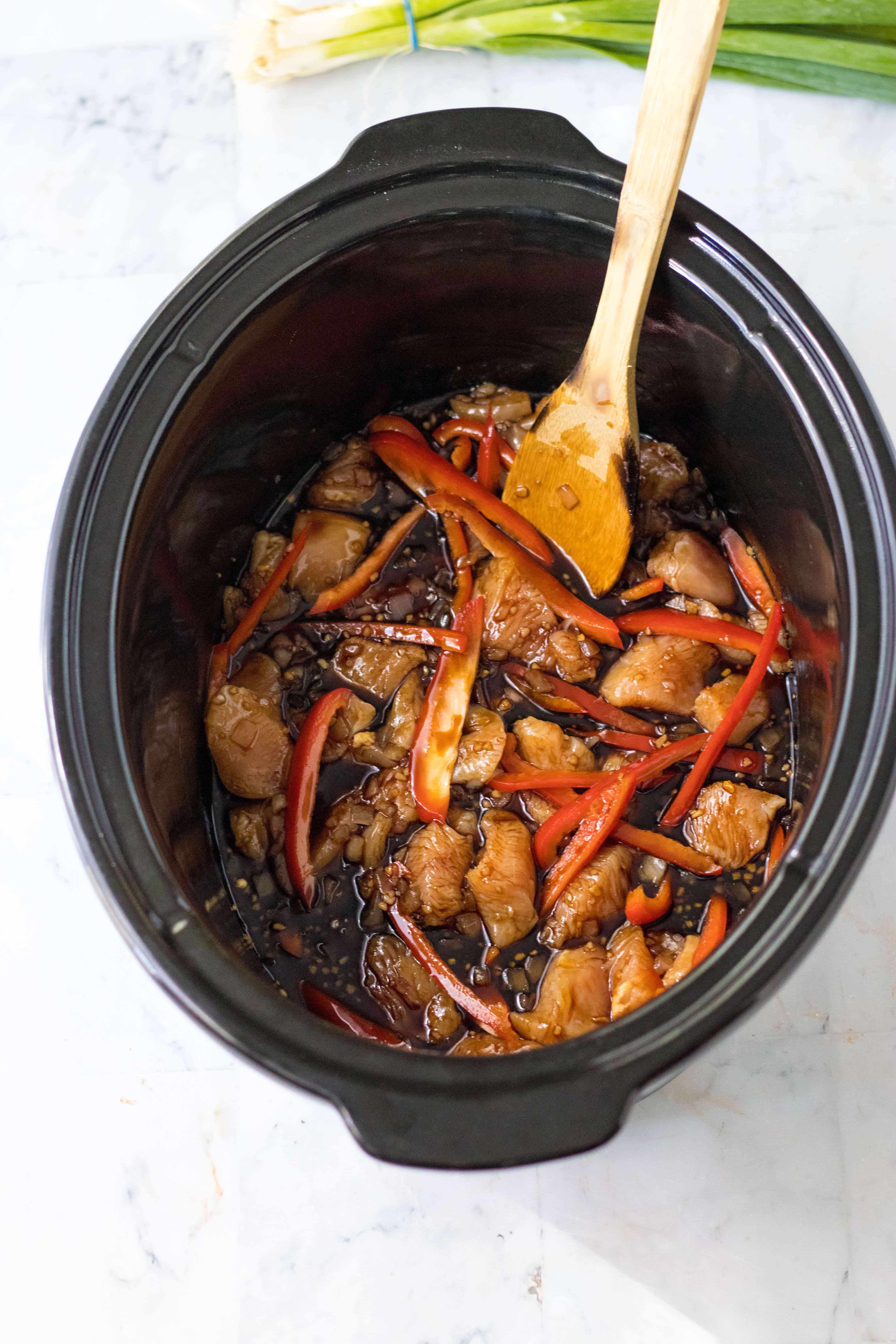 1. In your slow cooker place the cubed chicken, chopped onion and sliced red bell pepper.