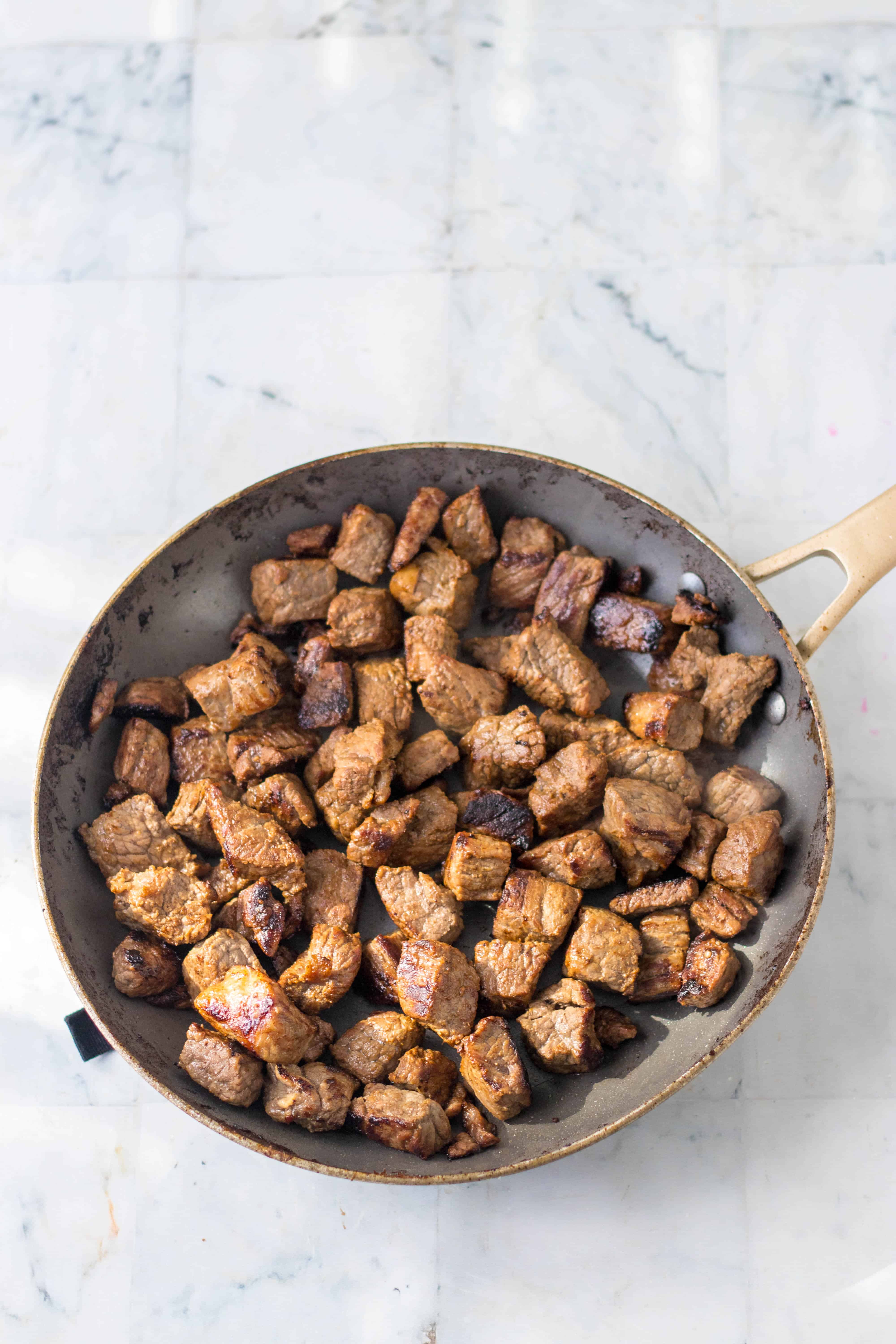 - Add the stew beef and cook until nicely brown on each side. We are not looking to cook the meat through, just brown the outside.