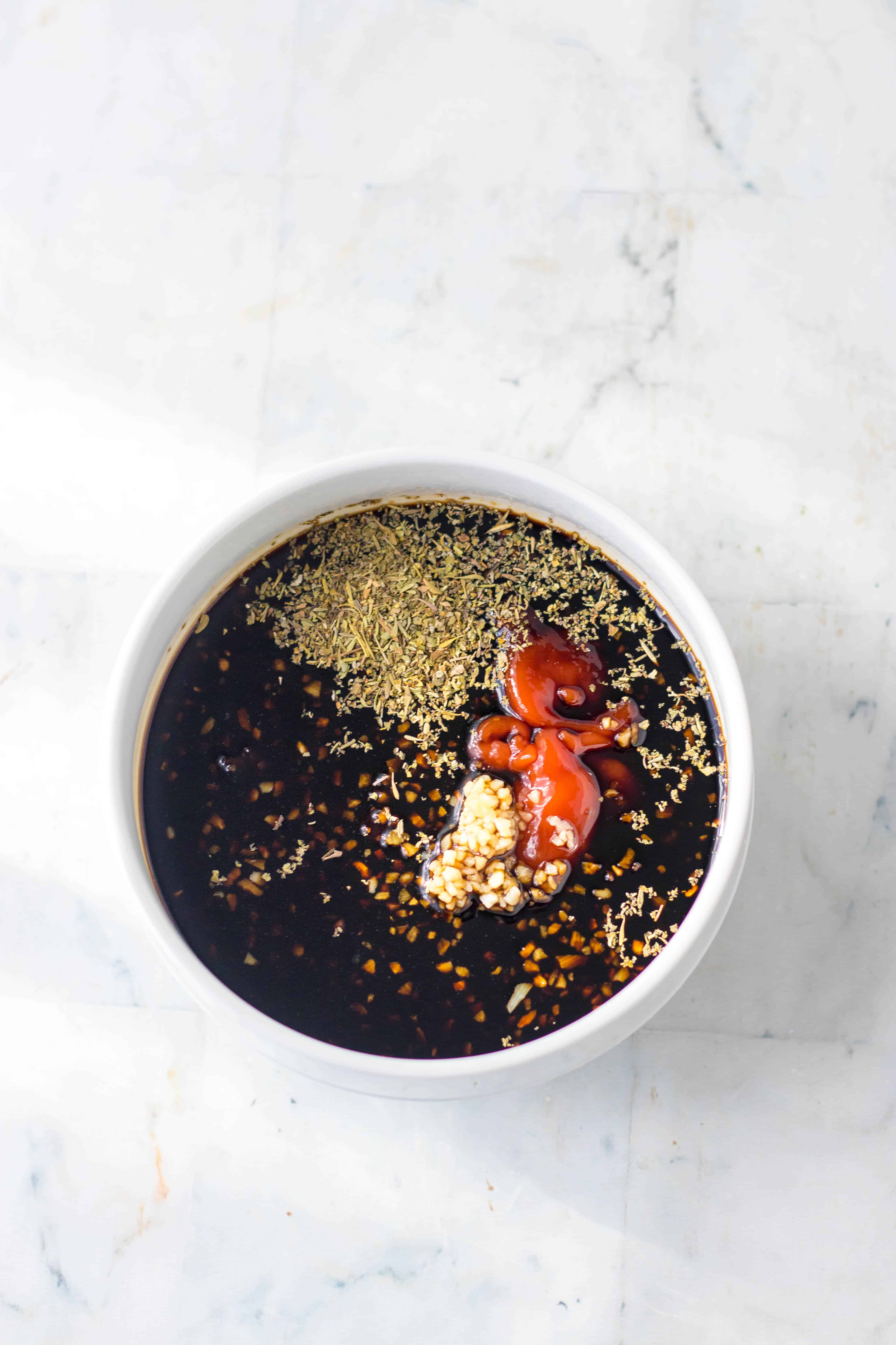- Combine the garlic, honey, ketchup, soy sauce and oregano together and pour over the meat.