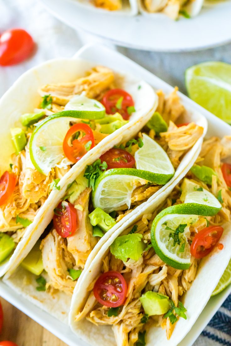 All you need to make these delicious tacos are chicken, honey, lime, garlic, broth, paprika and fajita seasoning. Then just pile it up on fluffy tortillas and dinner is done!