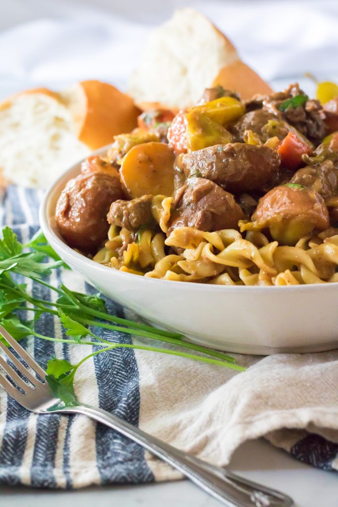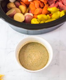 Brown gravy and ranch dry mixes come together for the perfect mix of flavors, and the gravy packet helps keep this stew nice and thick. The pepperoncinis add just a kick of flavor that brightens this dish up. The butter of course just makes everything rich and silky.