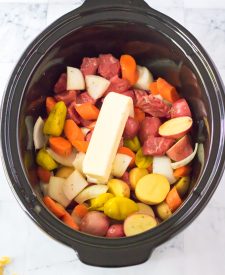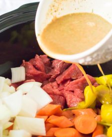 - In your slow cooker place your stew beef, potatoes, carrots, onion and pepperoncinis.