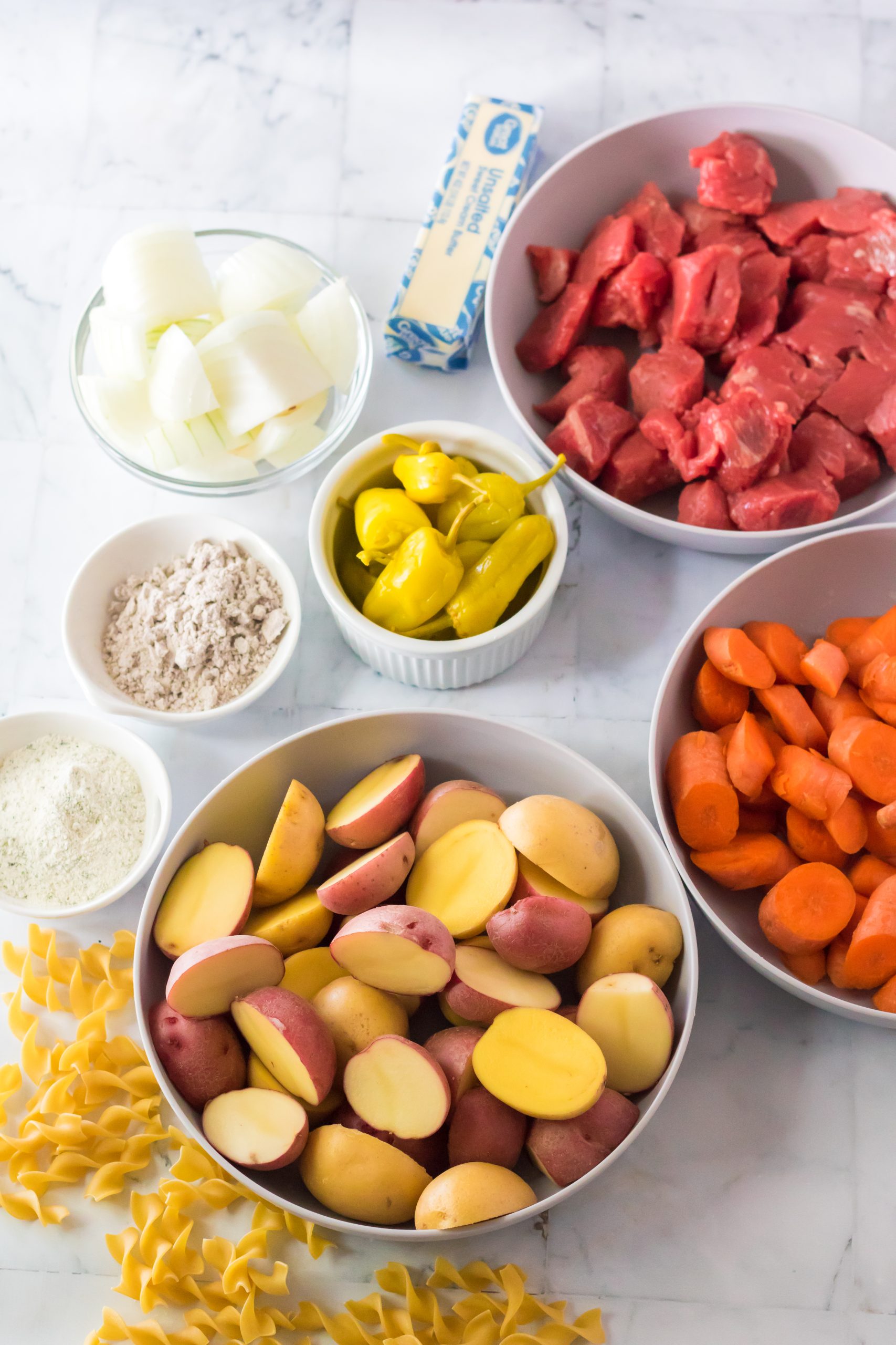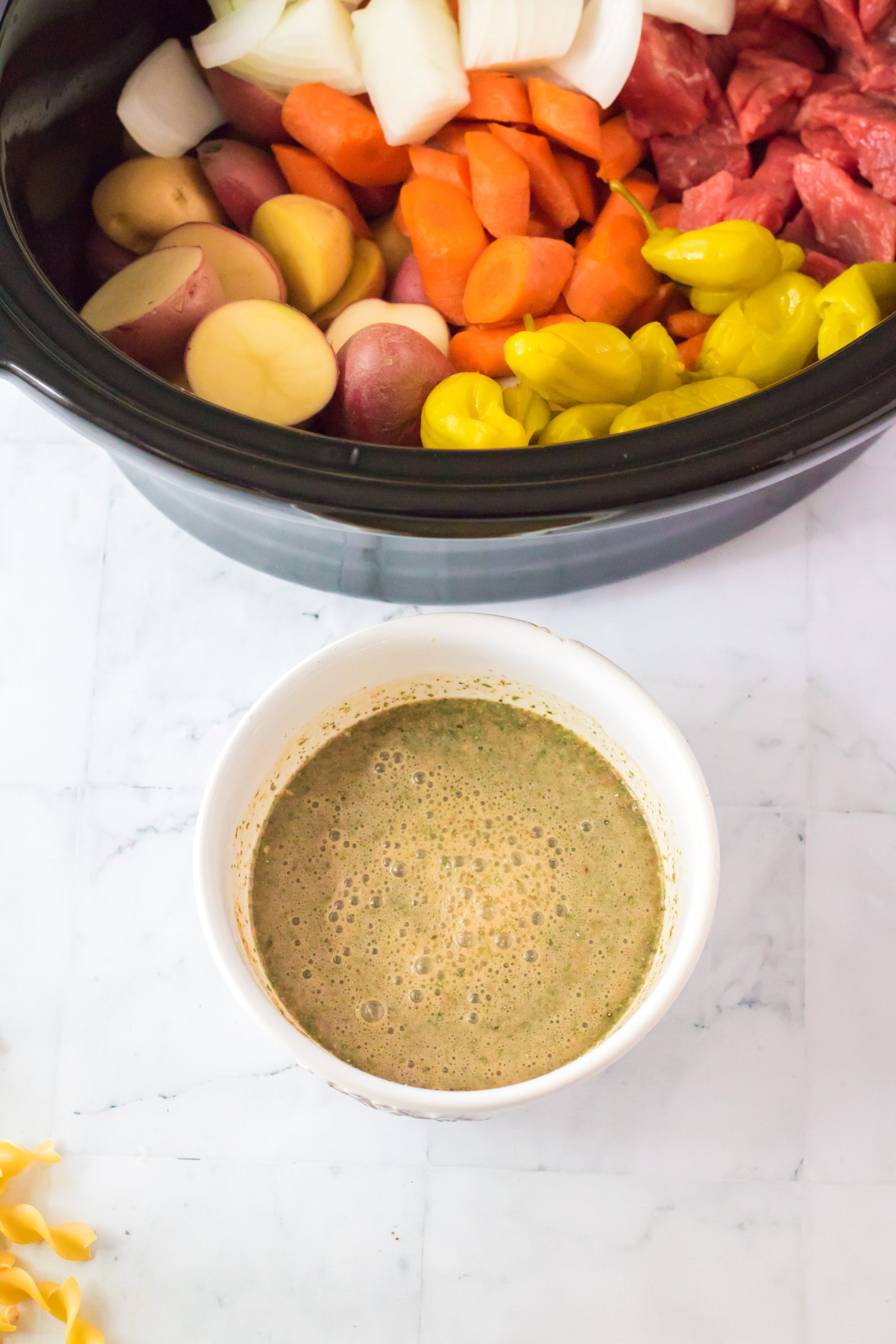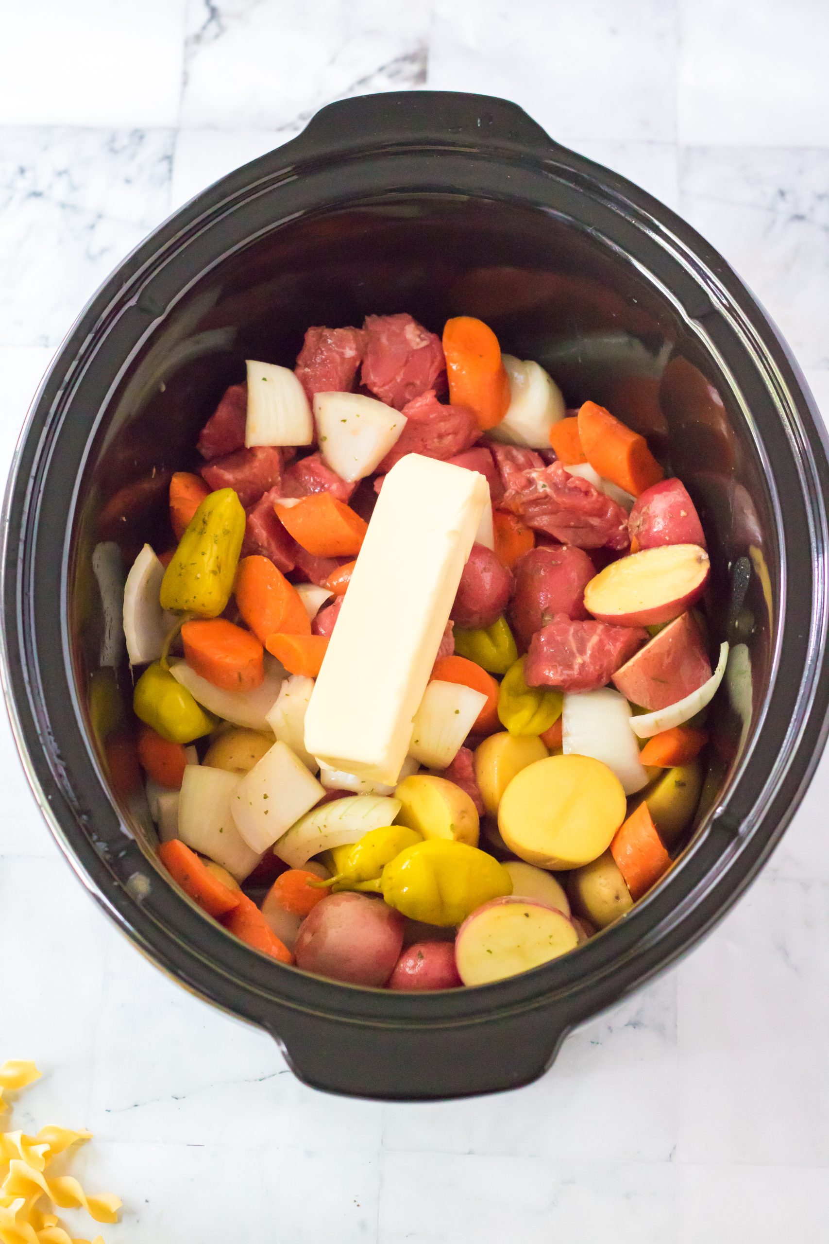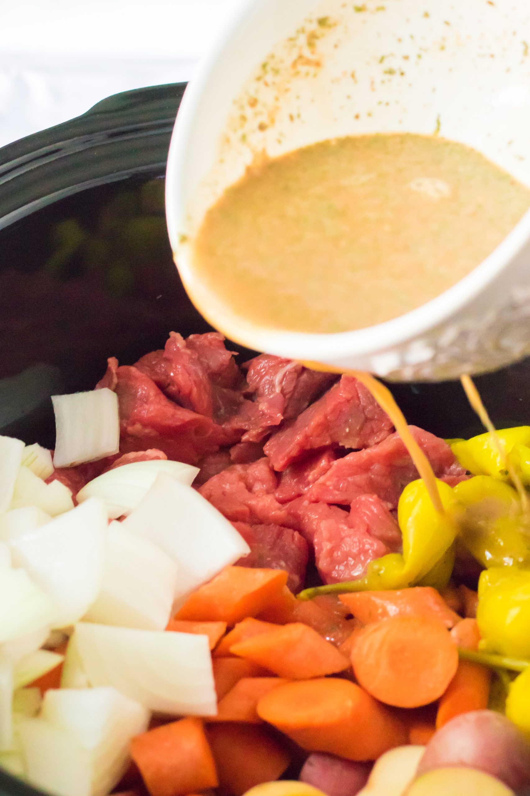 - In your slow cooker place your stew beef, potatoes, carrots, onion and pepperoncinis.