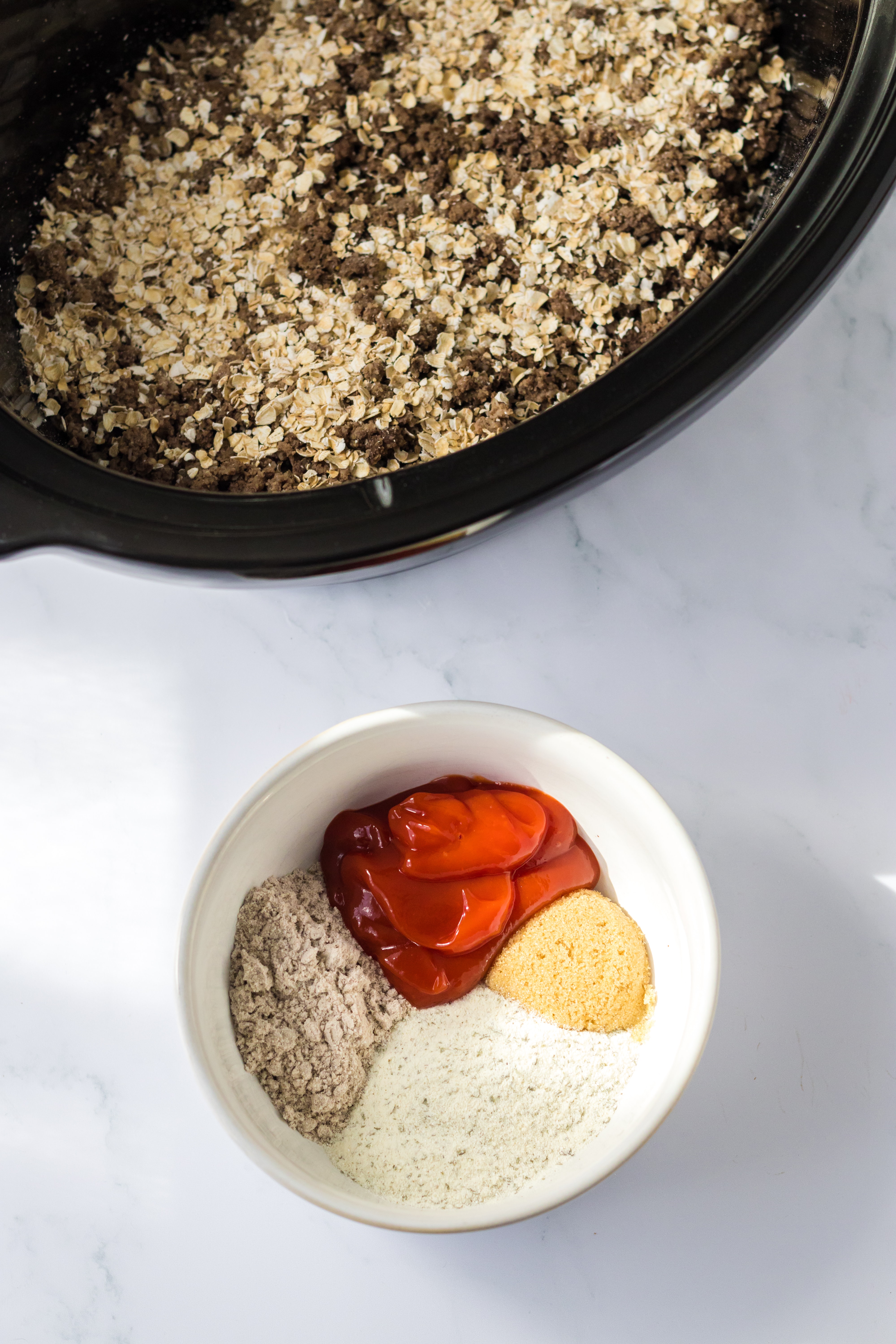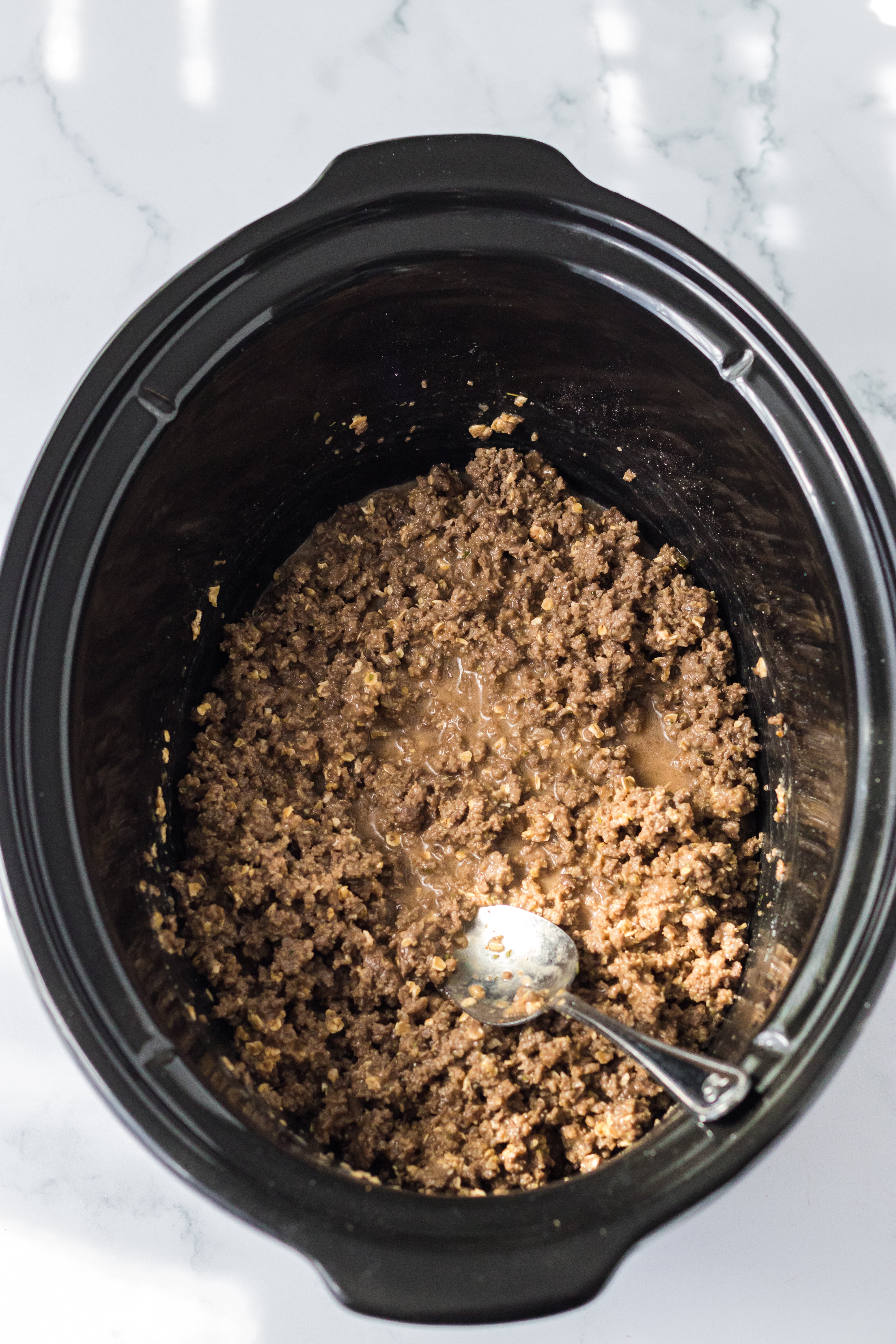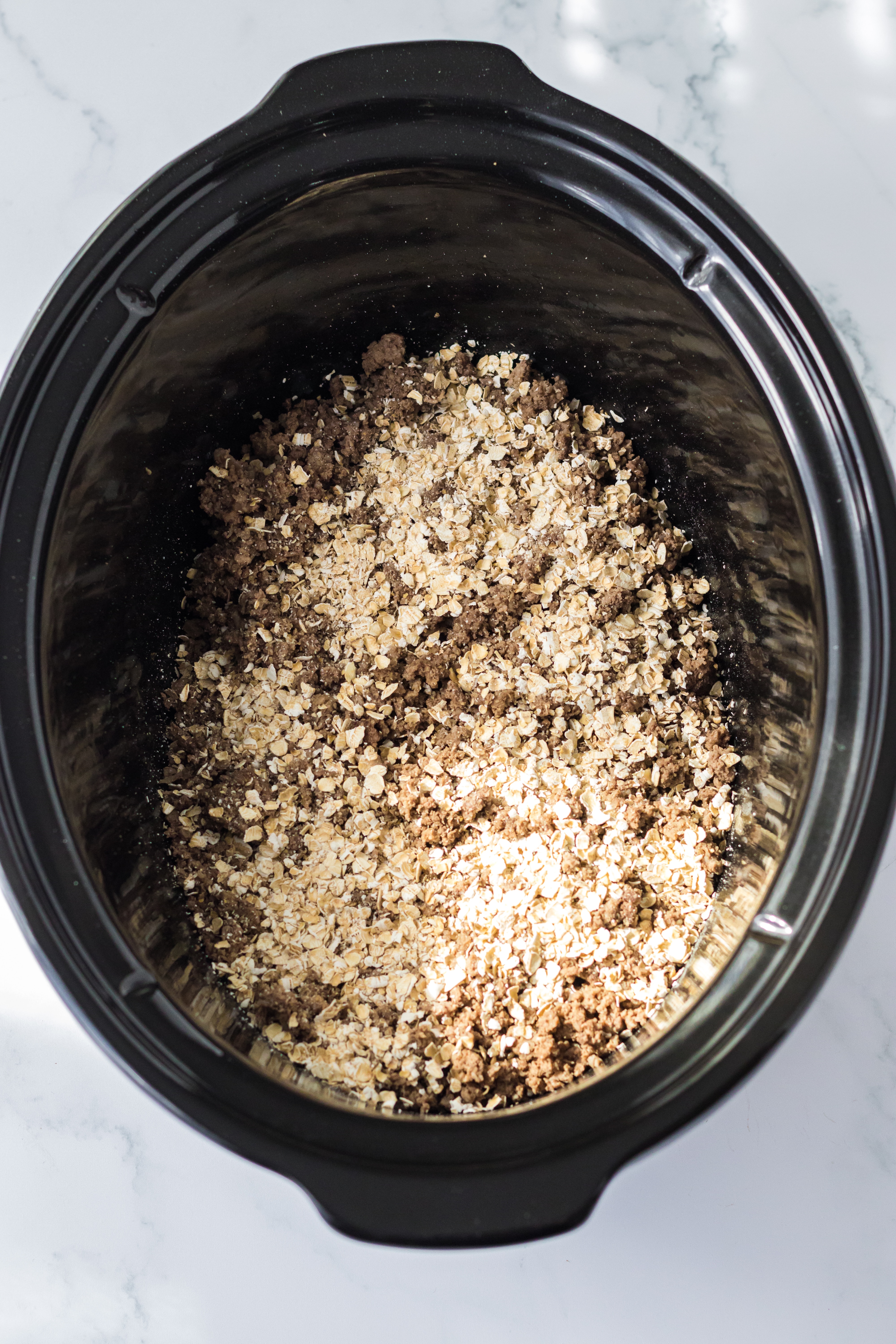 3. To the slow cooker add the oatmeal to the meat and stir.