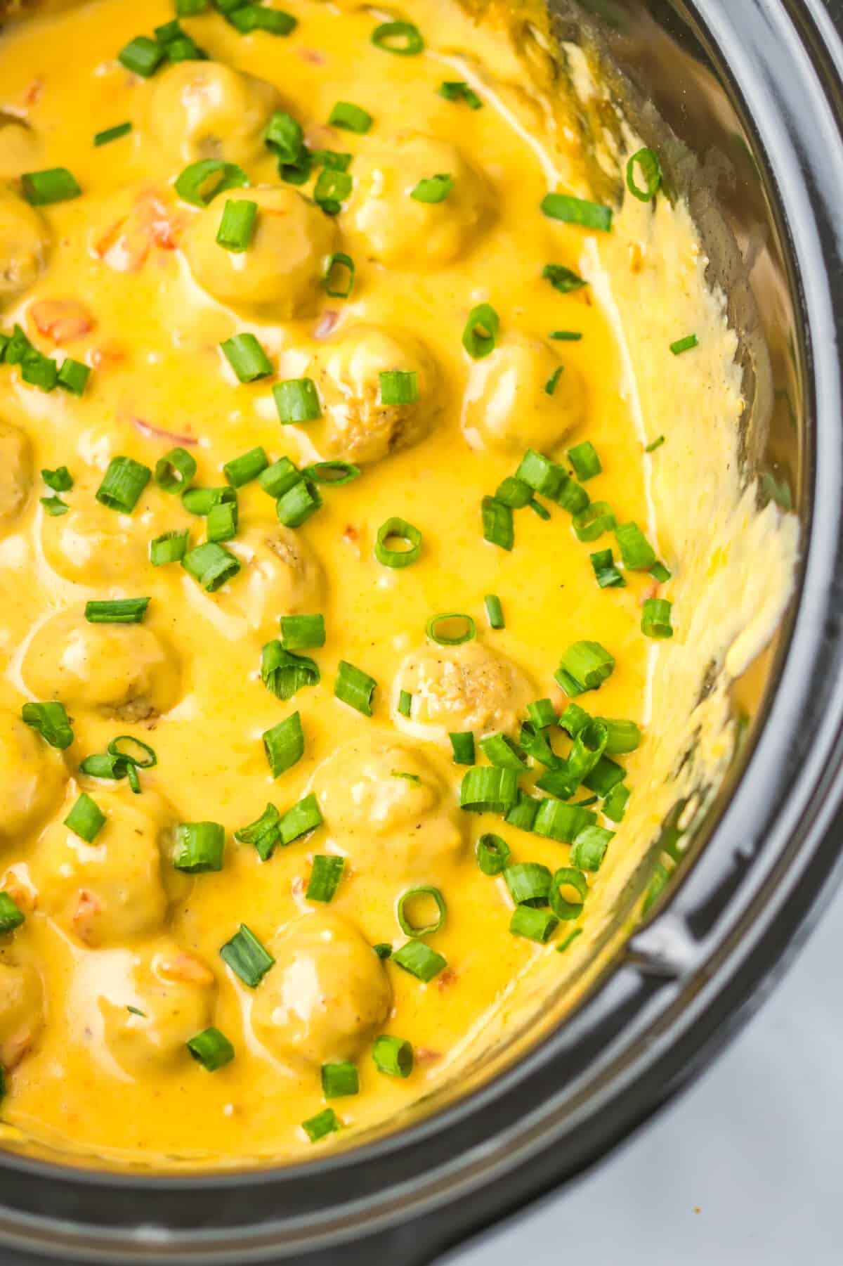 - Cover and cook on low for 4-6 hours until the cheese is all melted and meatballs are warmed through.