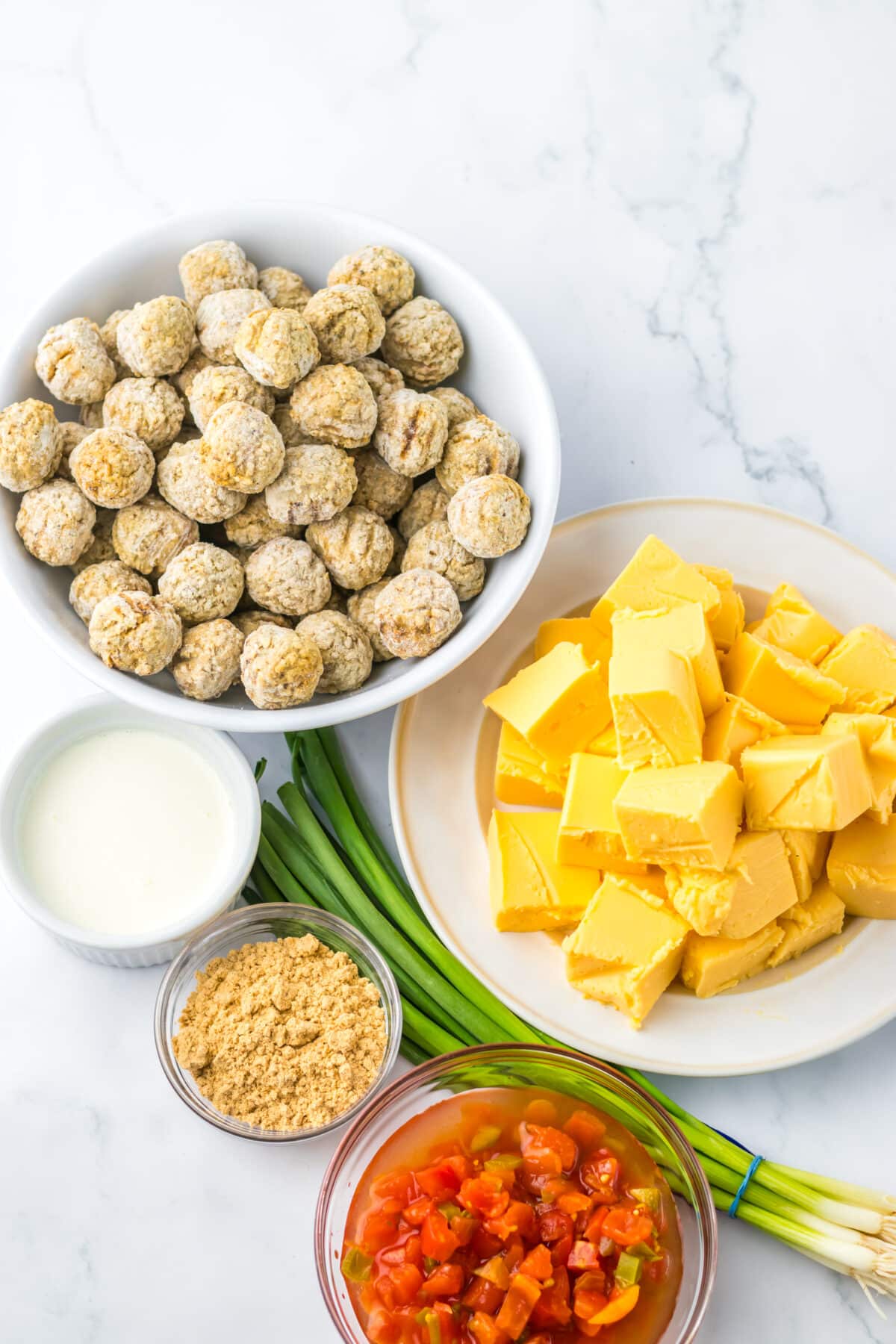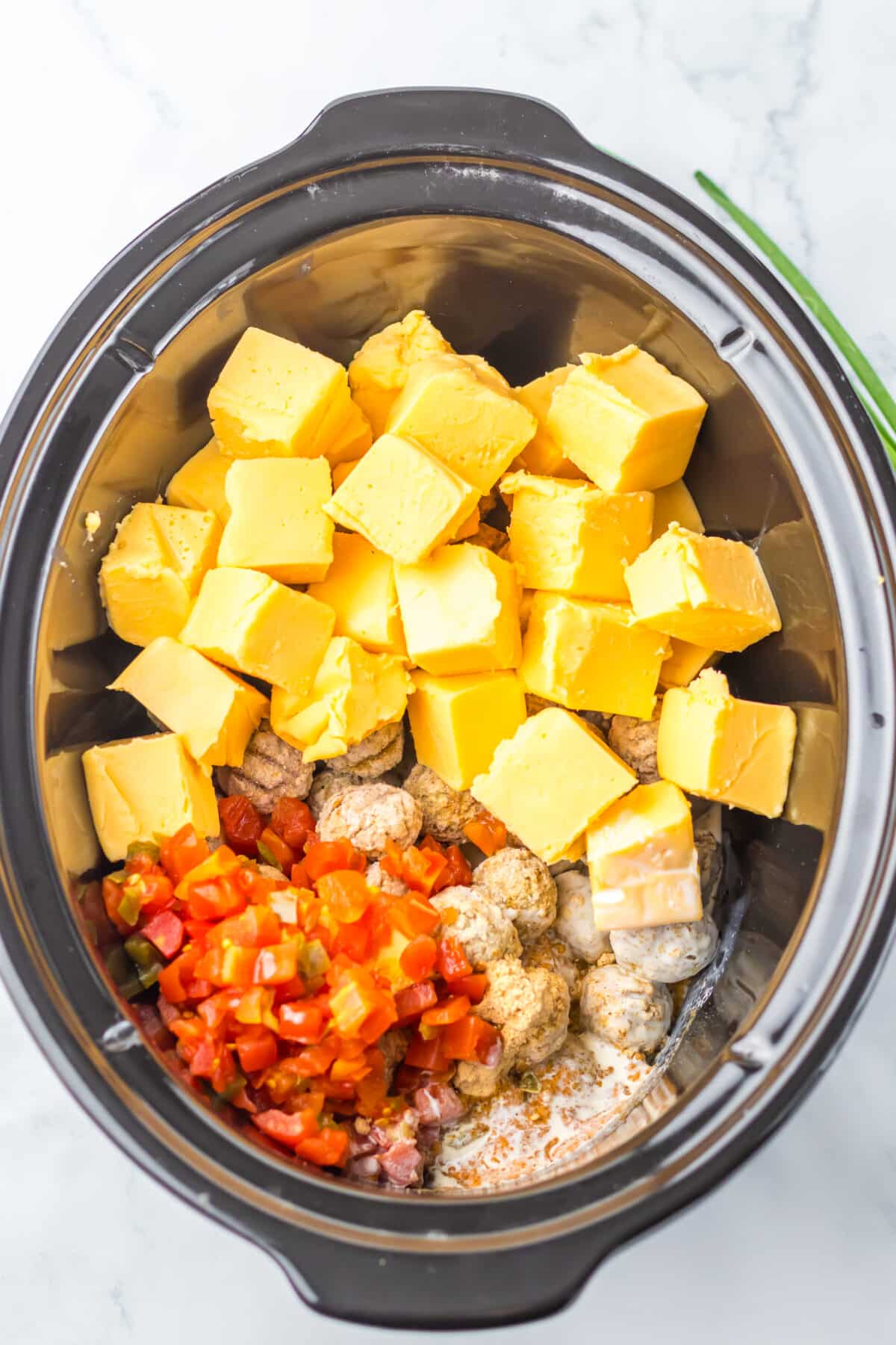 - To your slow cooker add the meatballs, tomatoes, cheese, taco seasoning and heavy cream.