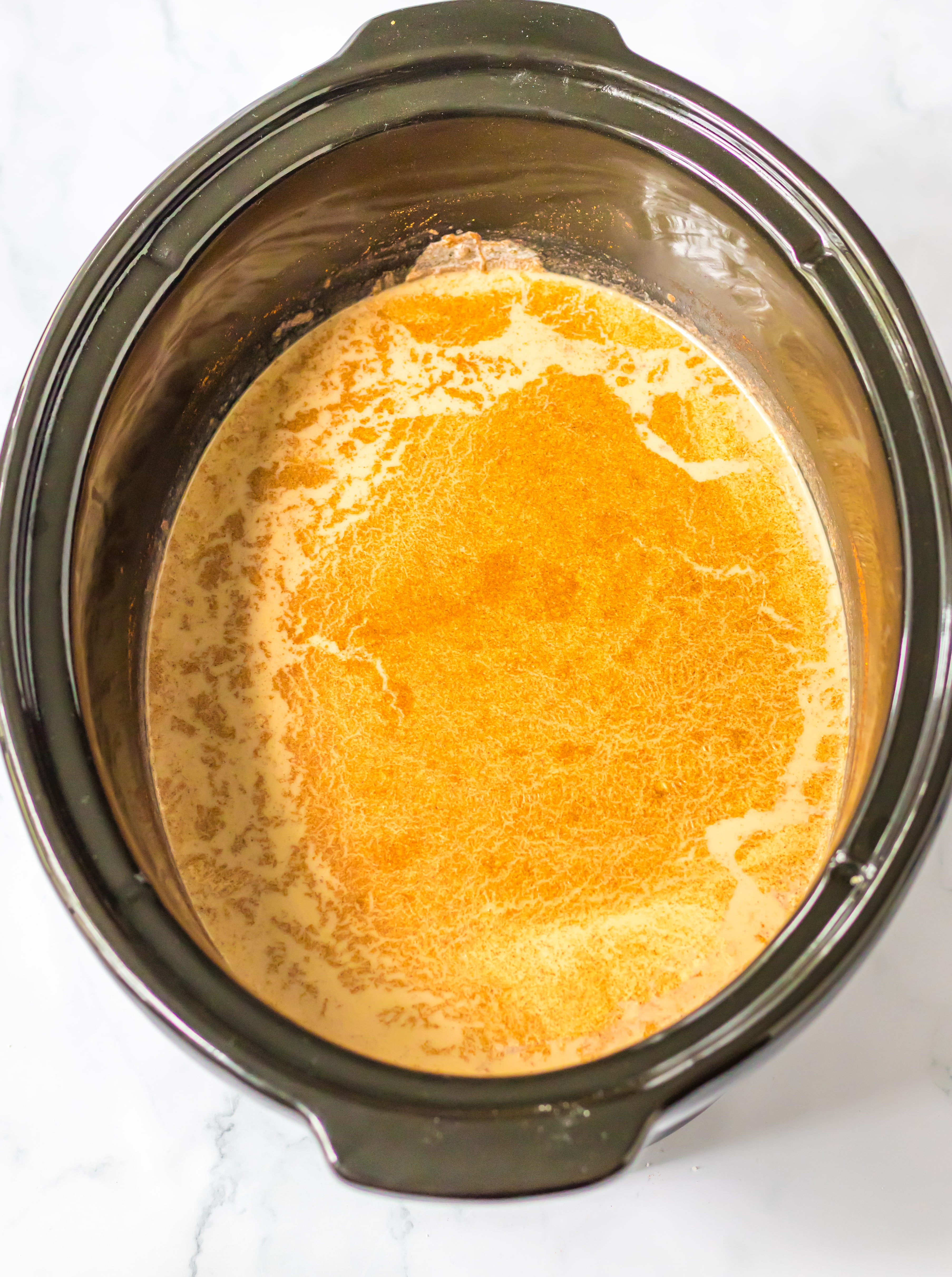 - Into your slow cooker place the coffee, milk, heavy whipping cream, pumpkin puree, brown sugar, vanilla and pumpkin pie spice.