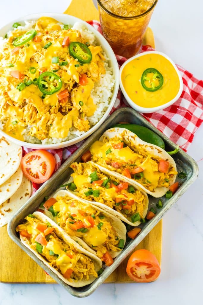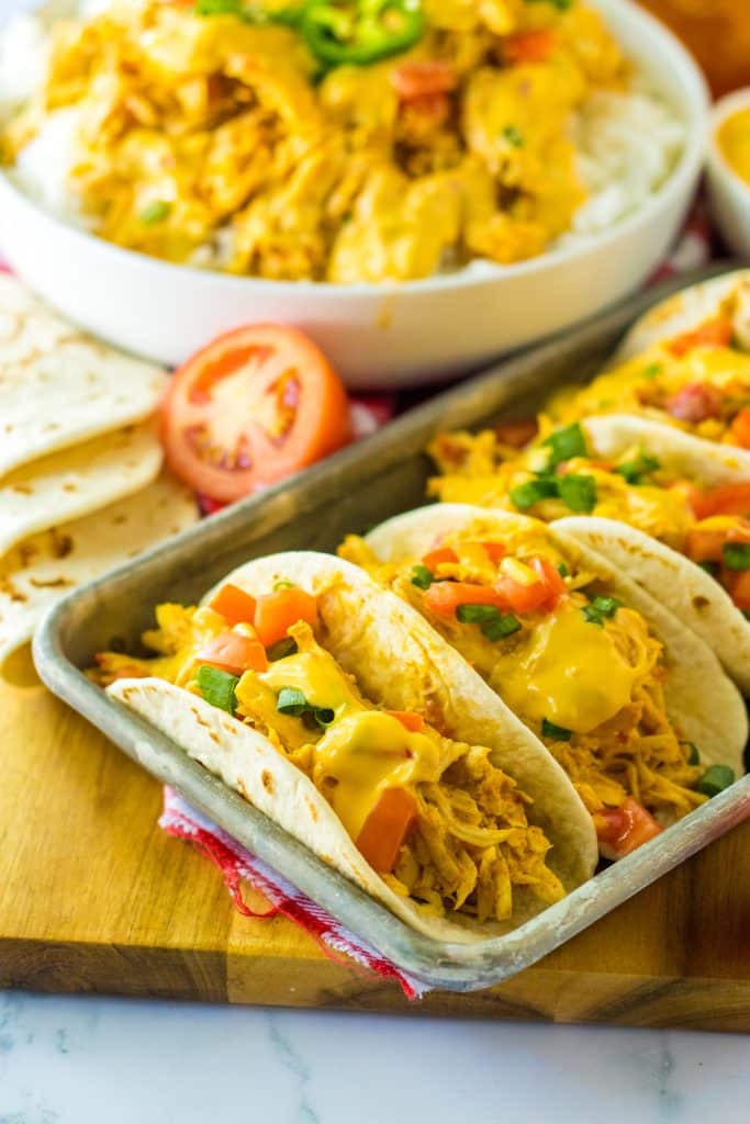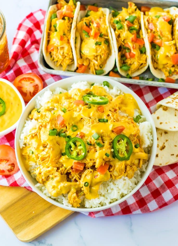 This cheesy taco chicken is so versatile! We love it in quesadillas, tacos, nachos, burritos or over rice for burrito bowls.