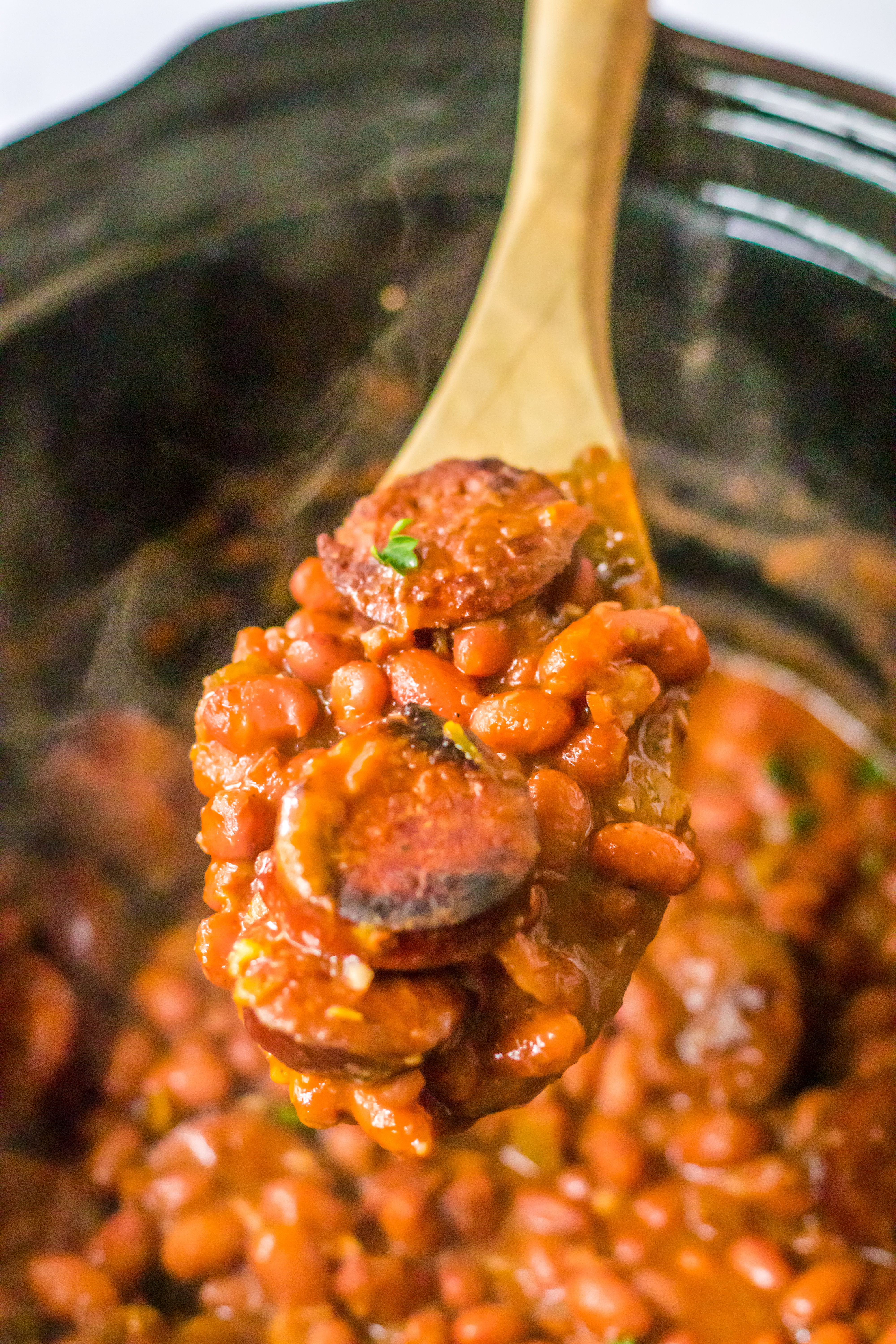 This dish is full of flavorful sausage, veggies, and beans that cook down into a hearty dish full of flavor. This is such a stick-to-your-ribs classic meal and always a favorite with my family.