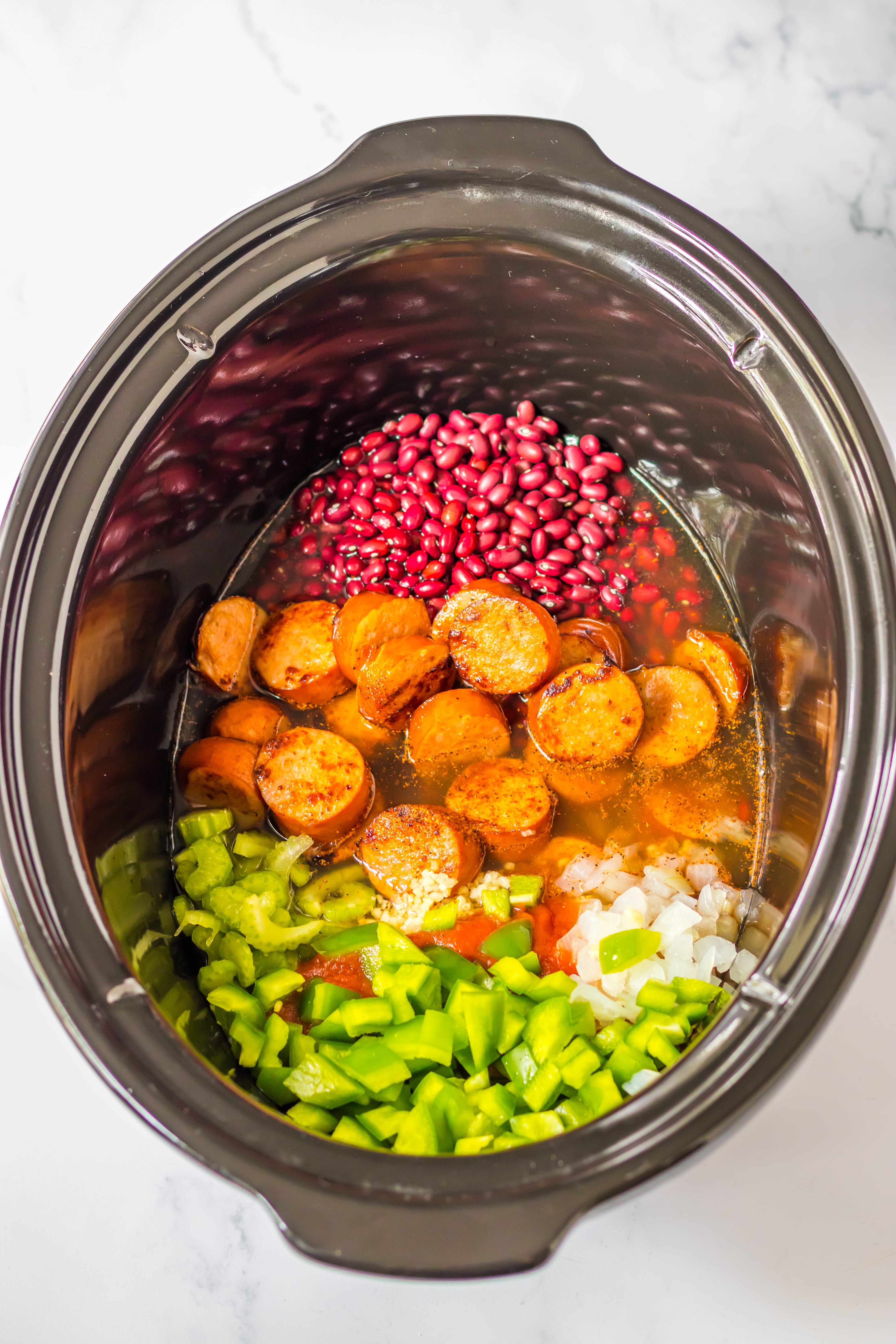 - To your slow cooker add the beans, celery, bell pepper, onion, garlic, tomato sauce, chicken stock and cajun seasoning.