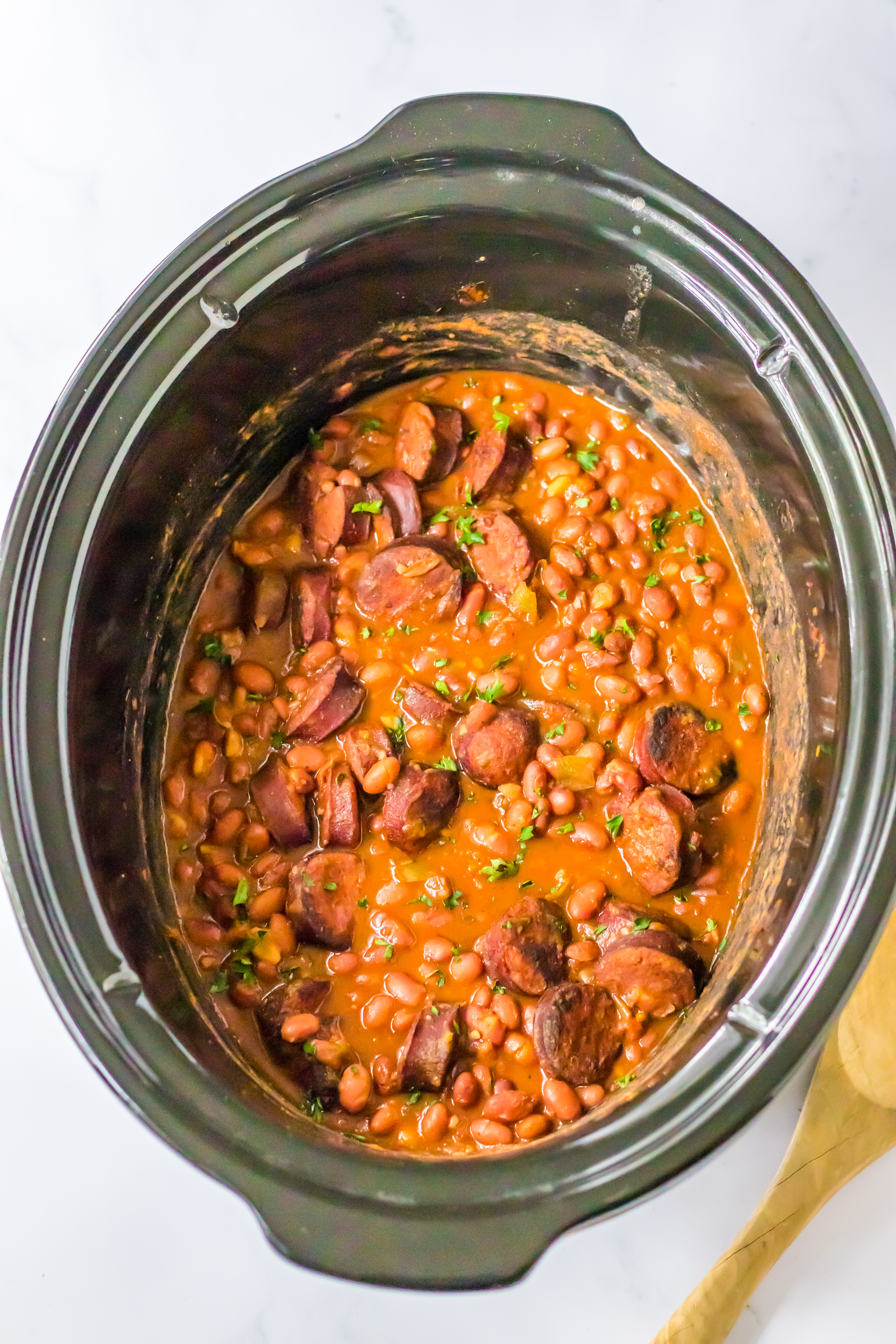 I like to use dried small red beans, some people like to use red kidney beans. Red kidney beans can pose a health risk is not prepared correctly. They must be boiled for 10 minutes before slow cooking. I prefer to just use the small red beans which require no preboiling.