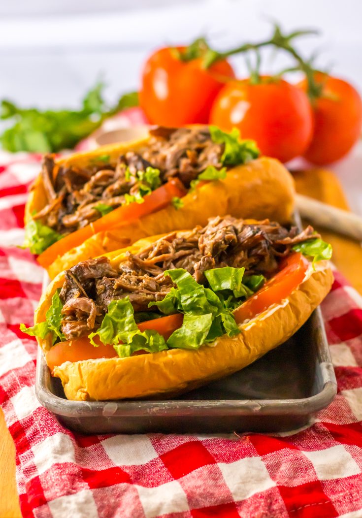 This meat just falls apart it is so tender. It slow cooks all day to perfection in brown gravy, au jus mix, onion powder and celery seed. You could use fresh onion and celery but I do not love them in this sandwich. The tender, flavorful beef gets piled high in soft, fluffy buns with lettuce and tomato. So simple but so delicious! Tastes just like a sandwich shop right at home! These tender roast beef subs are the ultimate comfort food. Don’t forget to dip your sandwich in the extra drippings.