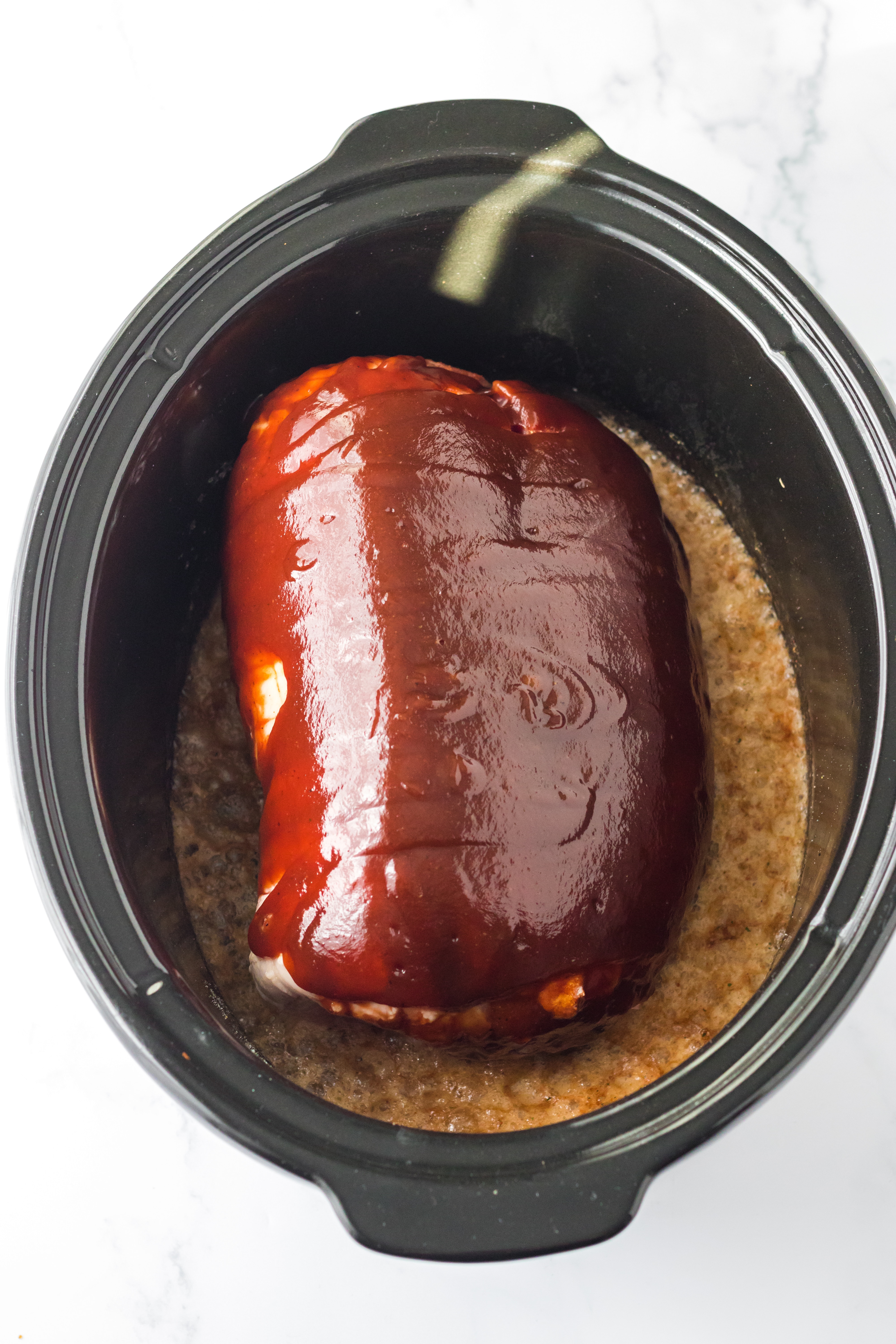 - Place the pork into the slow cooker.