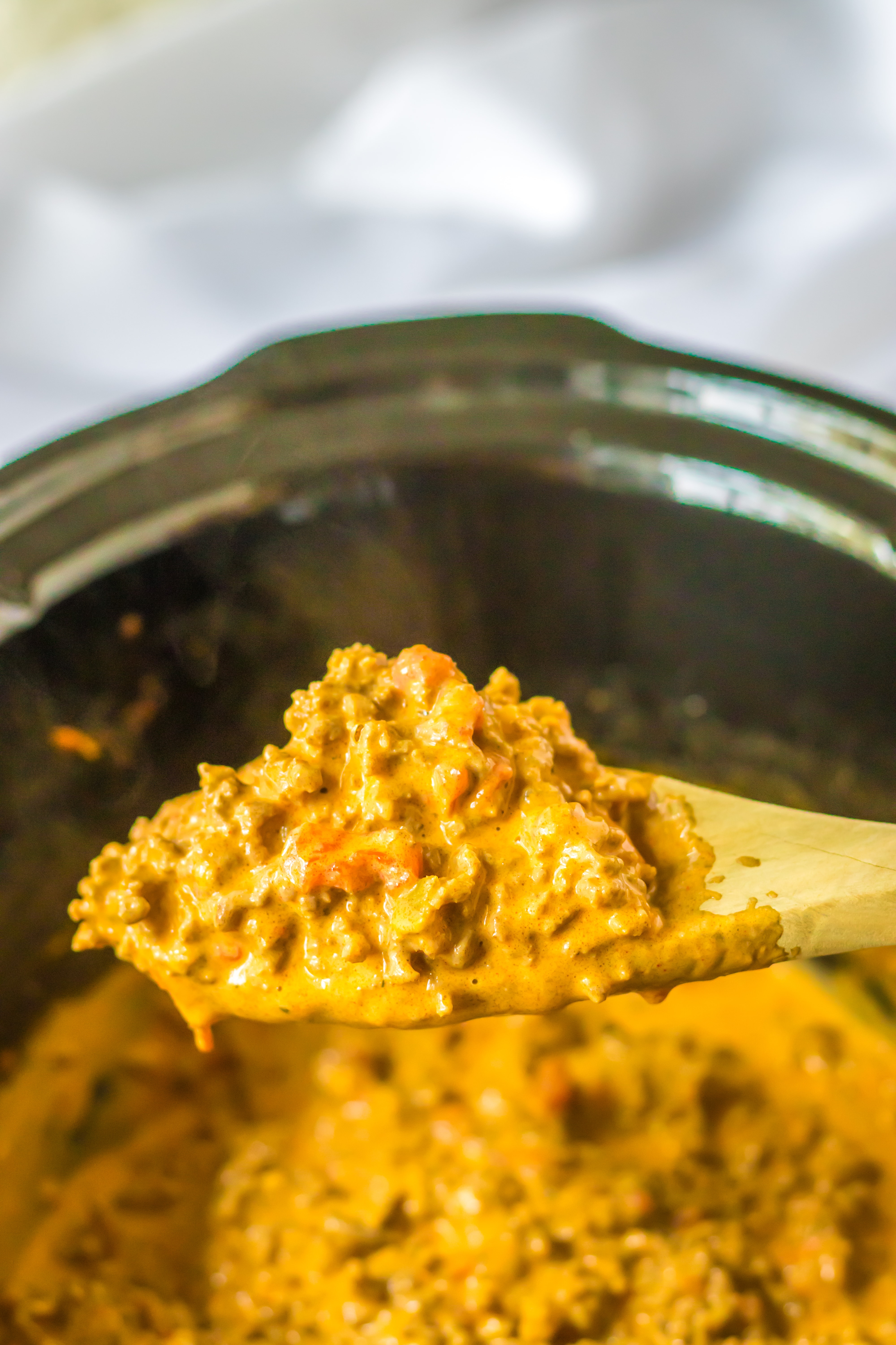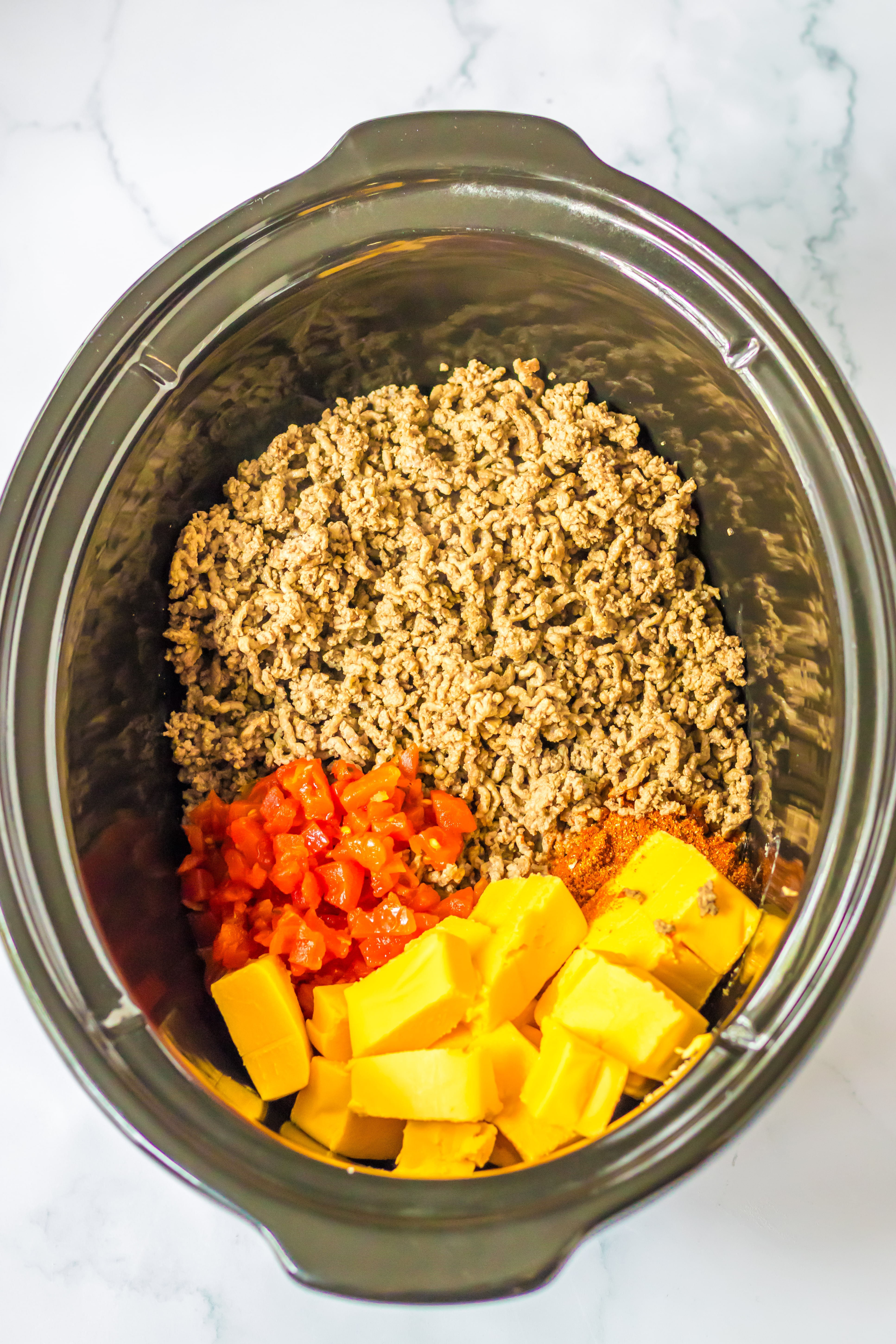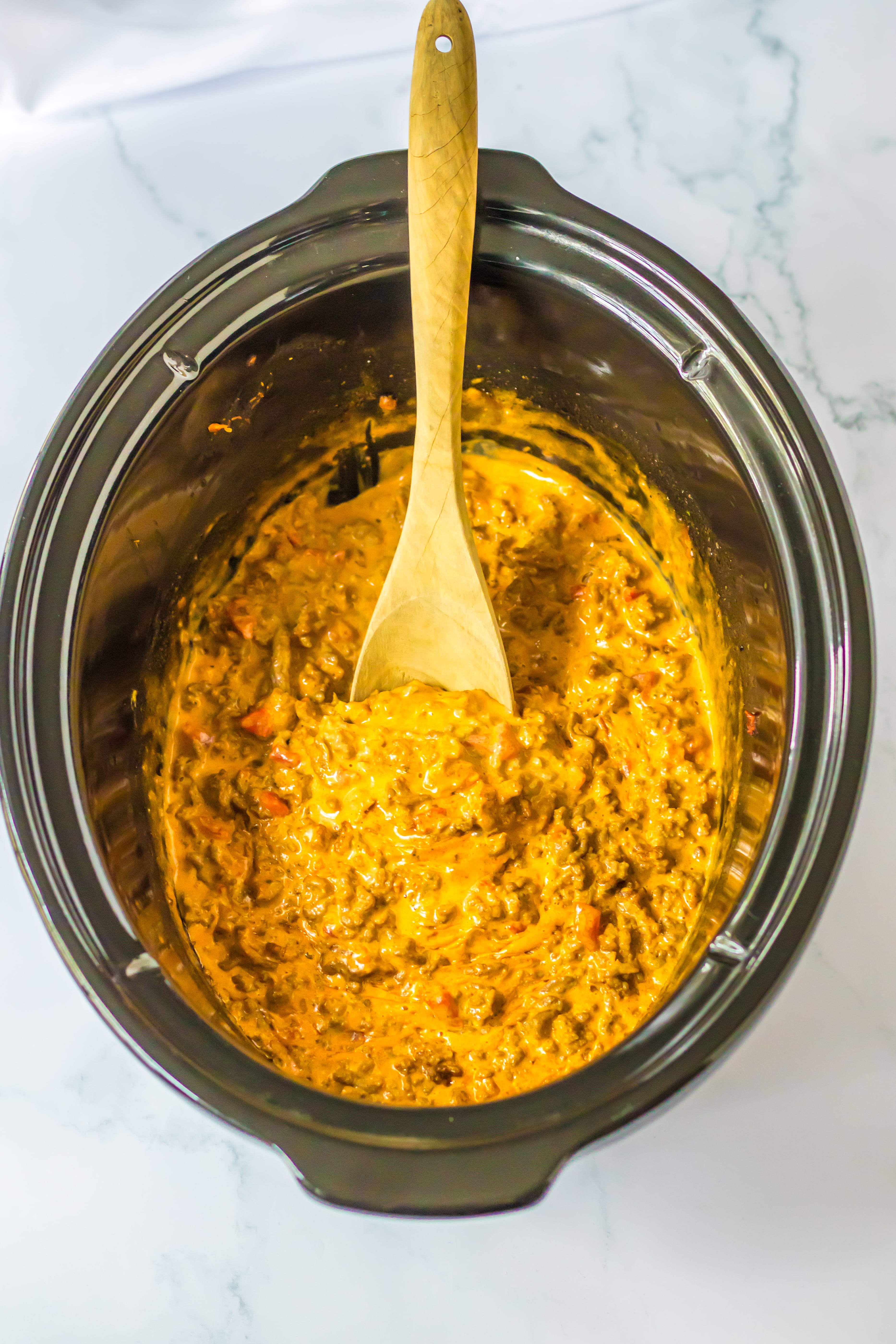- Into your slow cooker add the ground beef, taco seasoning, cheese, Rotel, and milk.