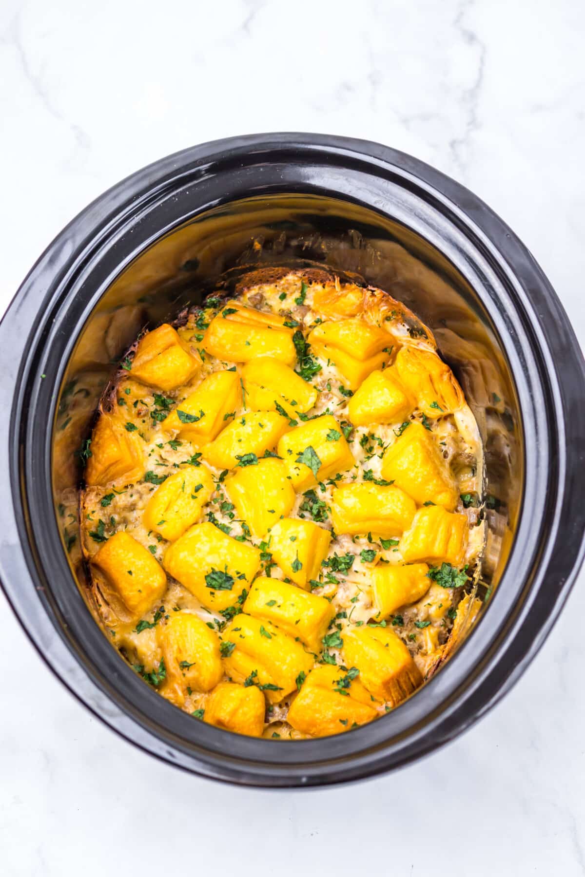 - Cover and cook on HIGH for 2–3 hours or LOW for 4–5 hours, until biscuits are cooked through and golden on top.
