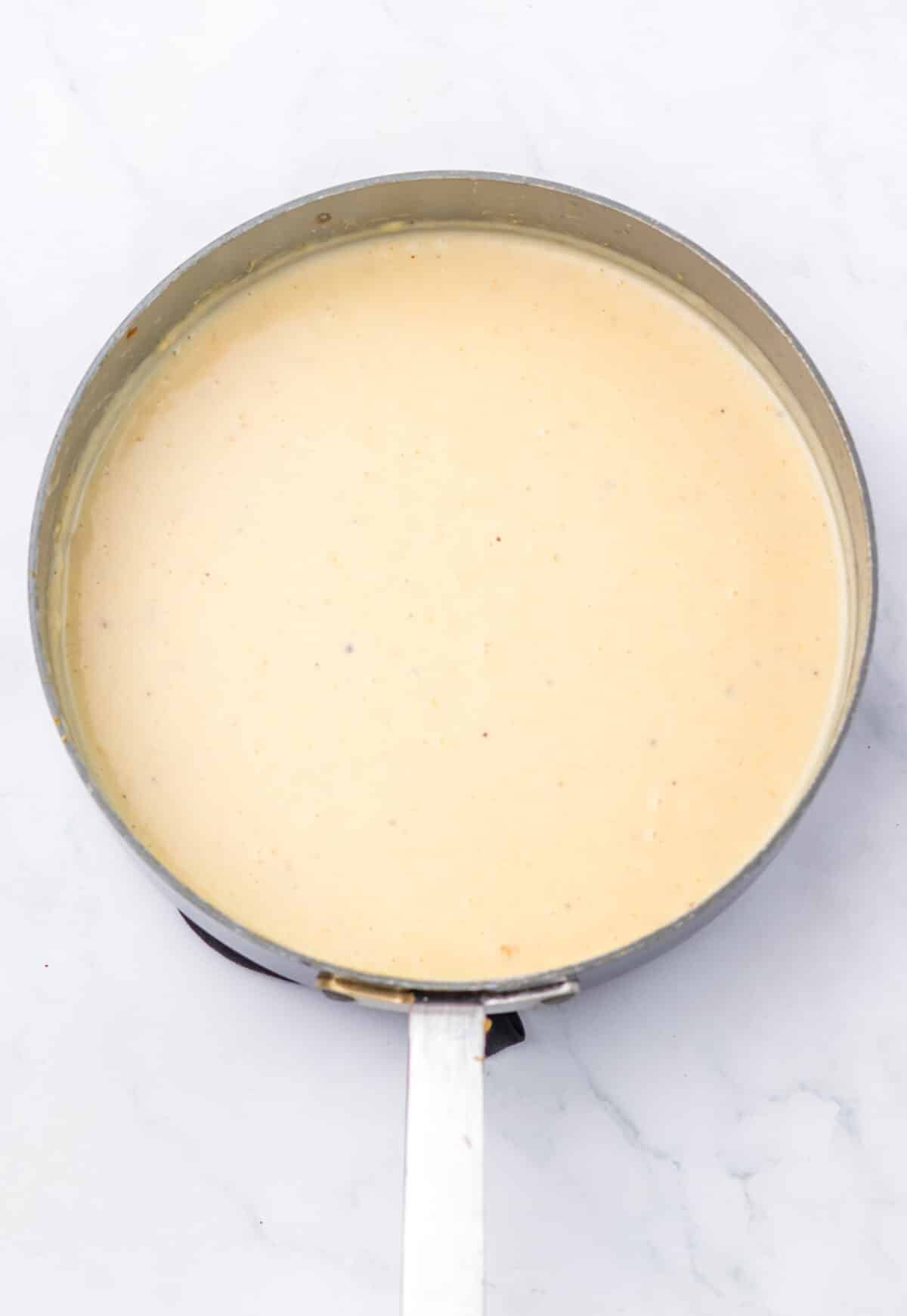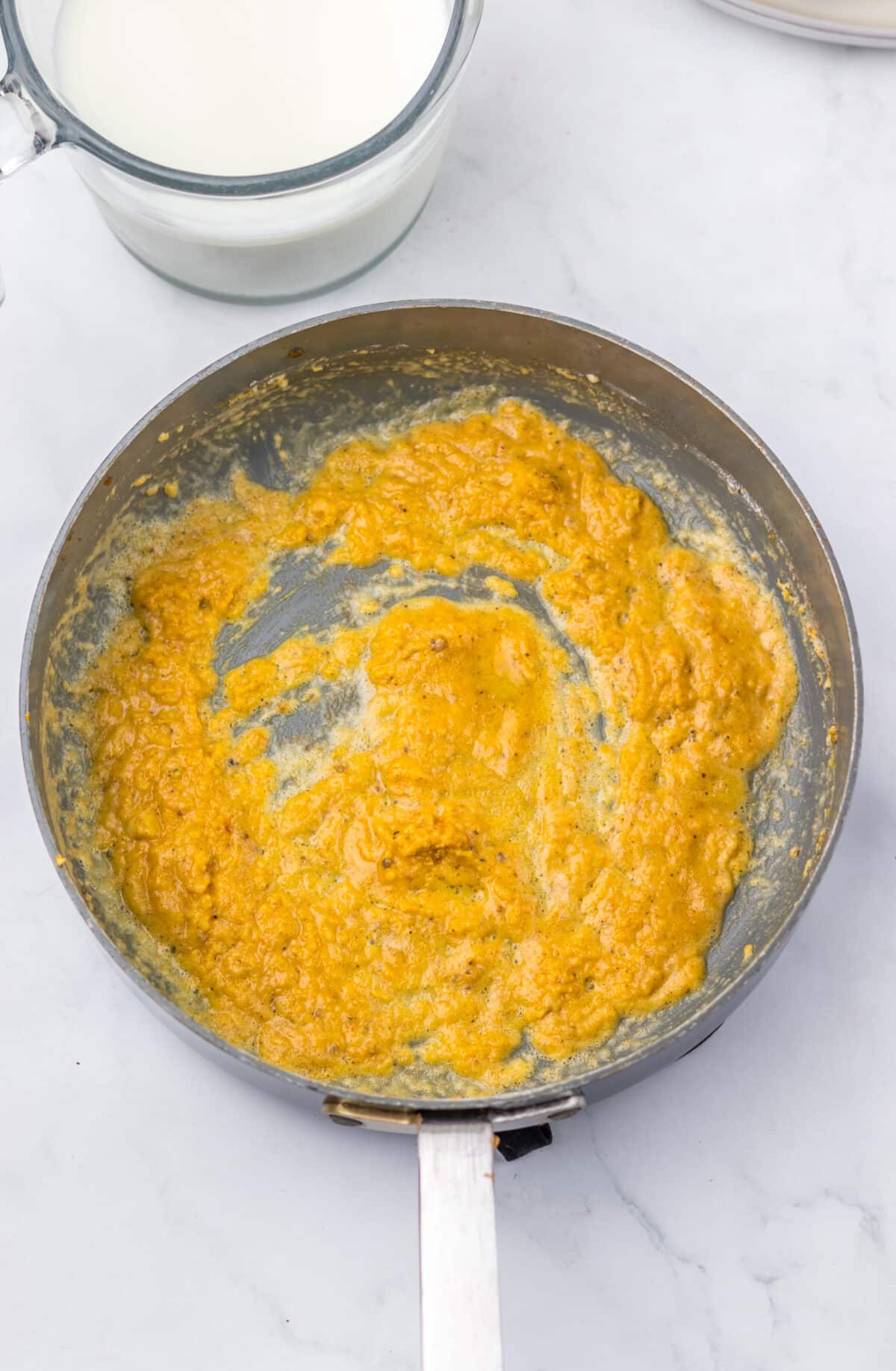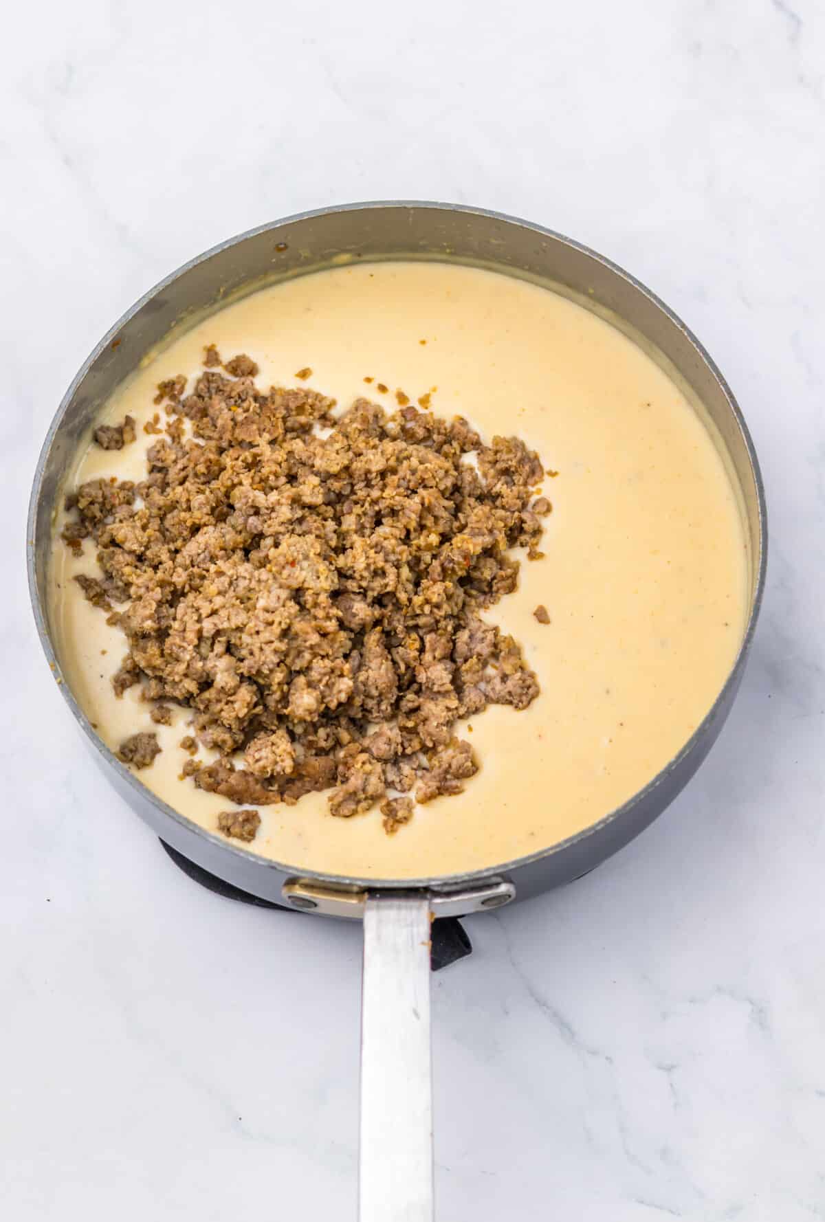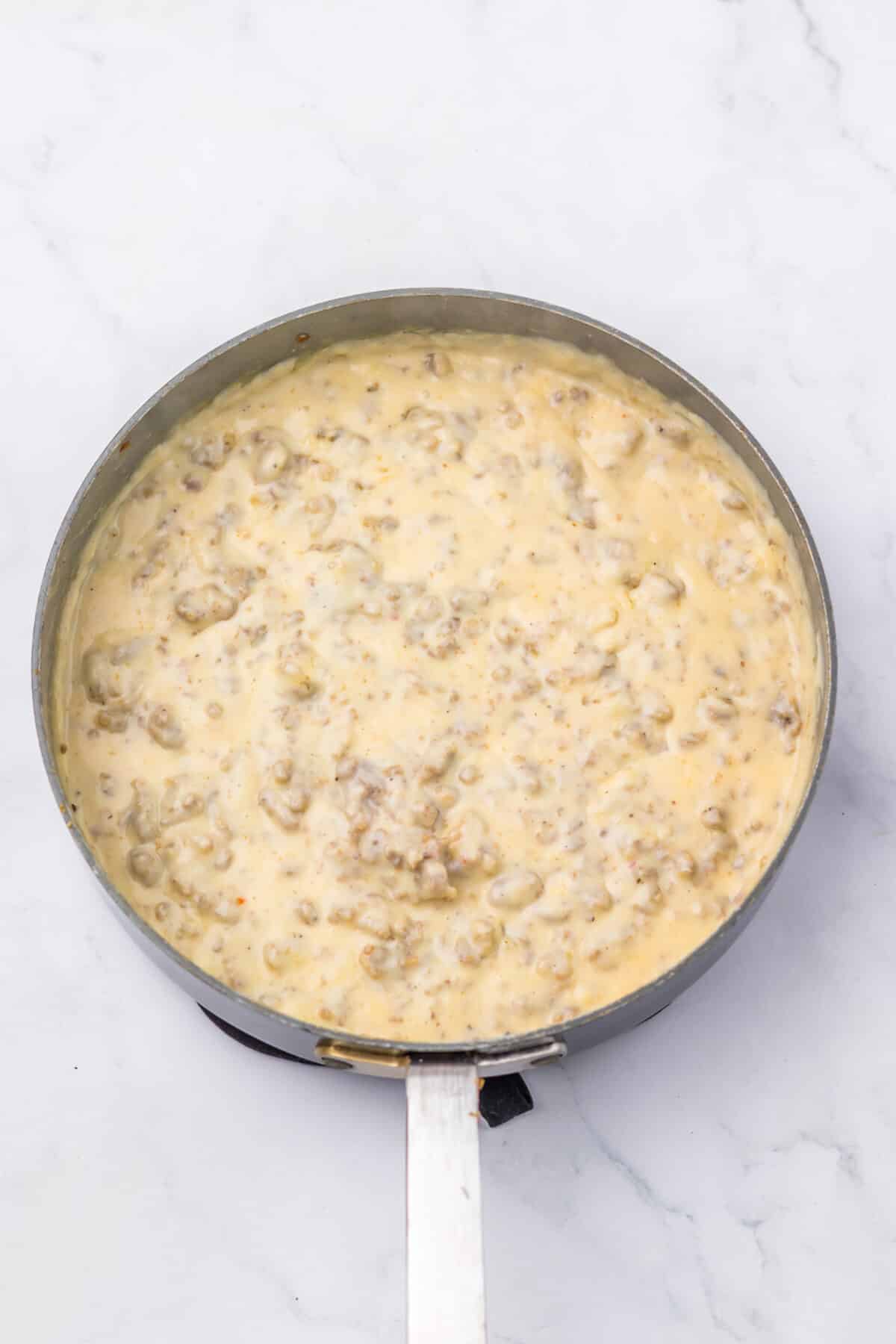 - Add butter to the skillet with sausage. Once melted, stir in flour and cook for 1–2 minutes. Slowly whisk in milk, a little at a time, until smooth and thickened.