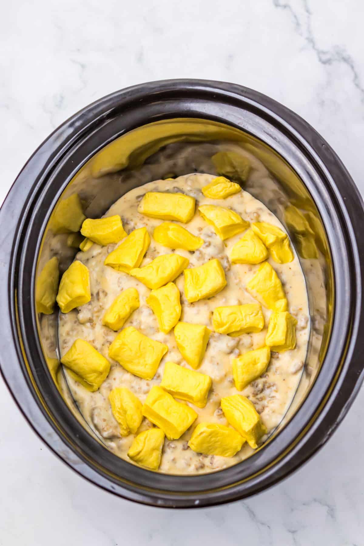 - Cut refrigerated biscuits into 6 pieces and place half on the bottom of the slow cooker.