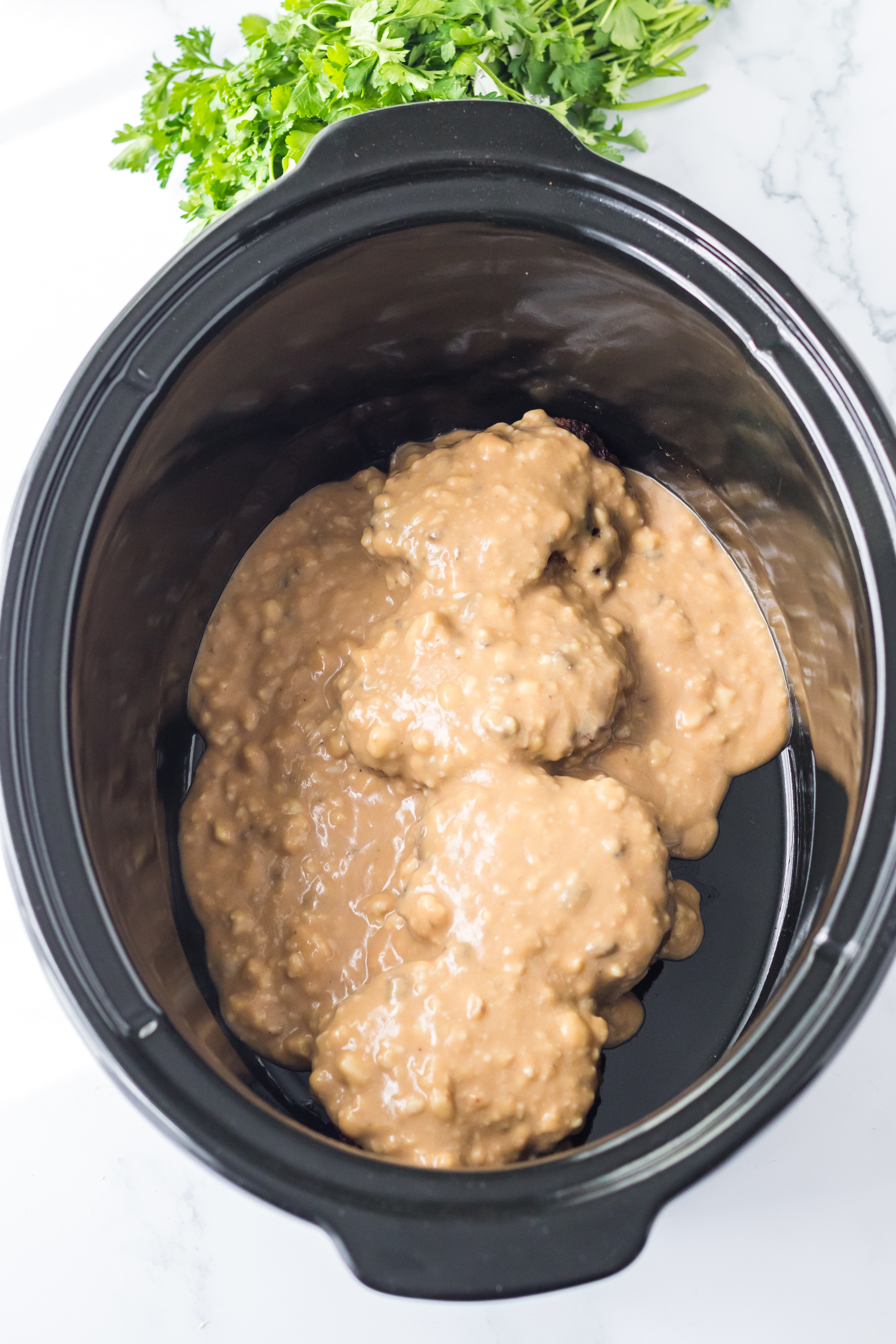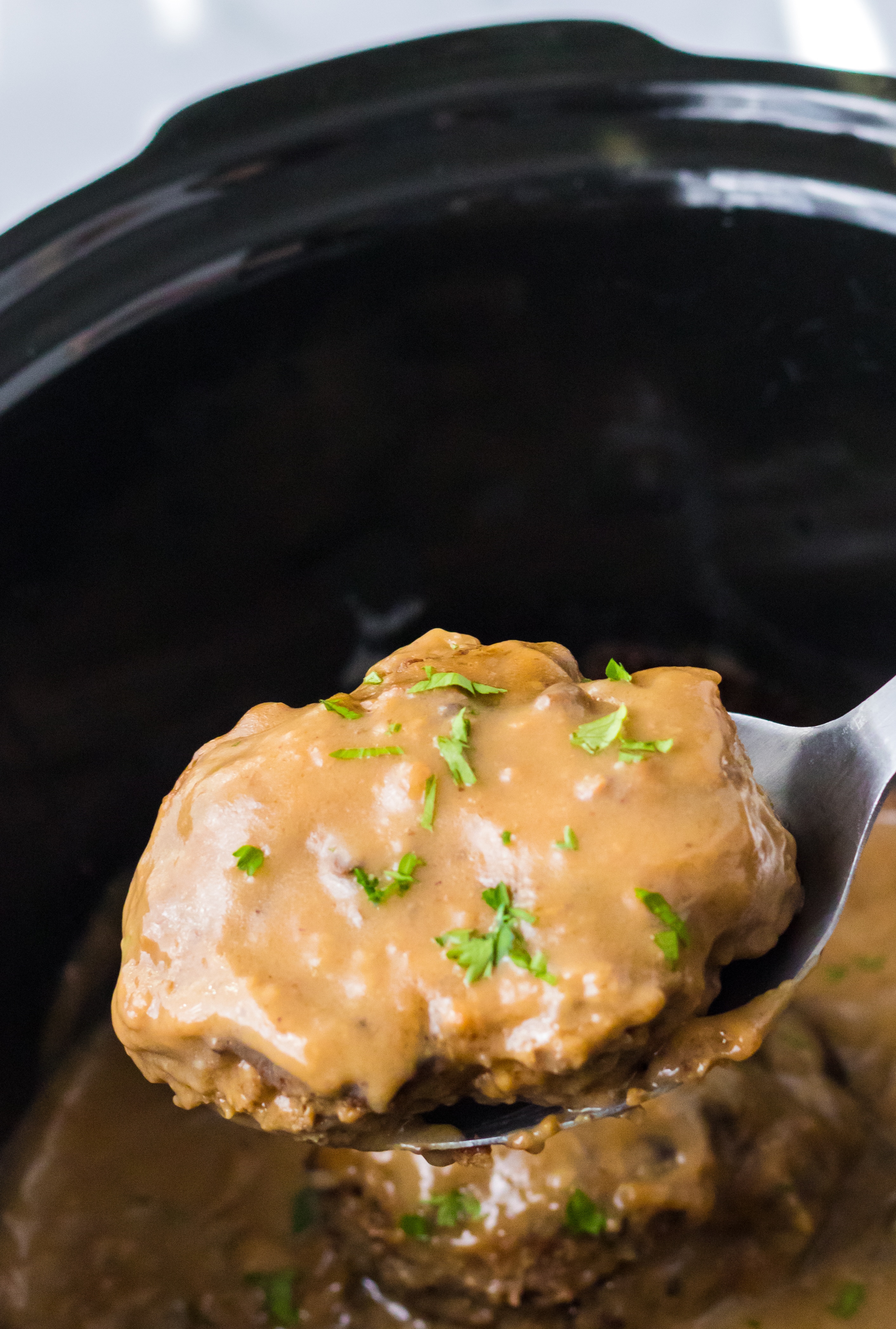 Hamburger steaks get seasoned up and quickly pan-fried until browned and popped in to the slow cooker with a delicious rich brown gravy made from cream of mushroom soup and brown gravy mix.
