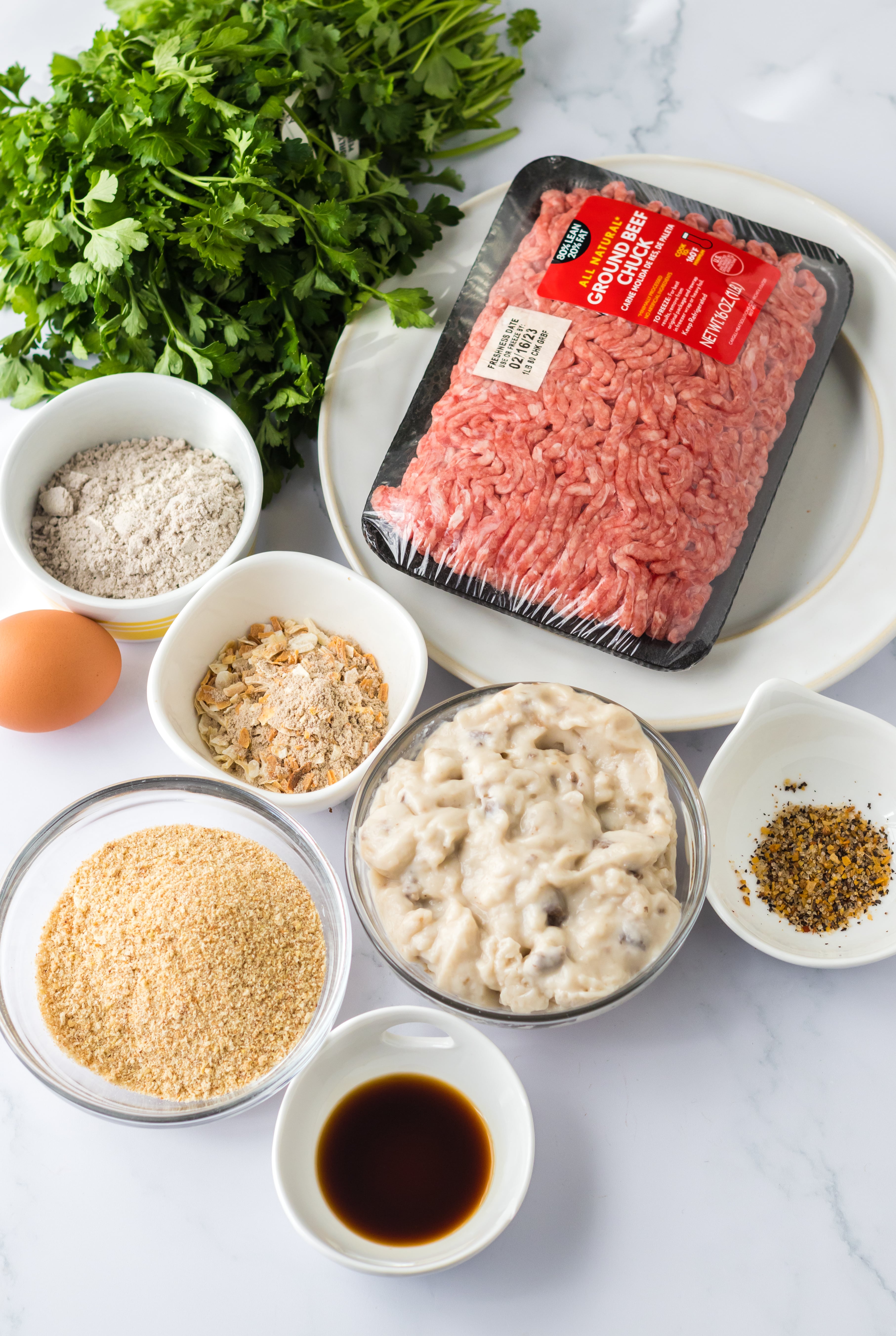 - Combine the ground beef, onion soup mix, worcheshire sauce, steak seasoning, egg and bread crumbs in a large bowl.