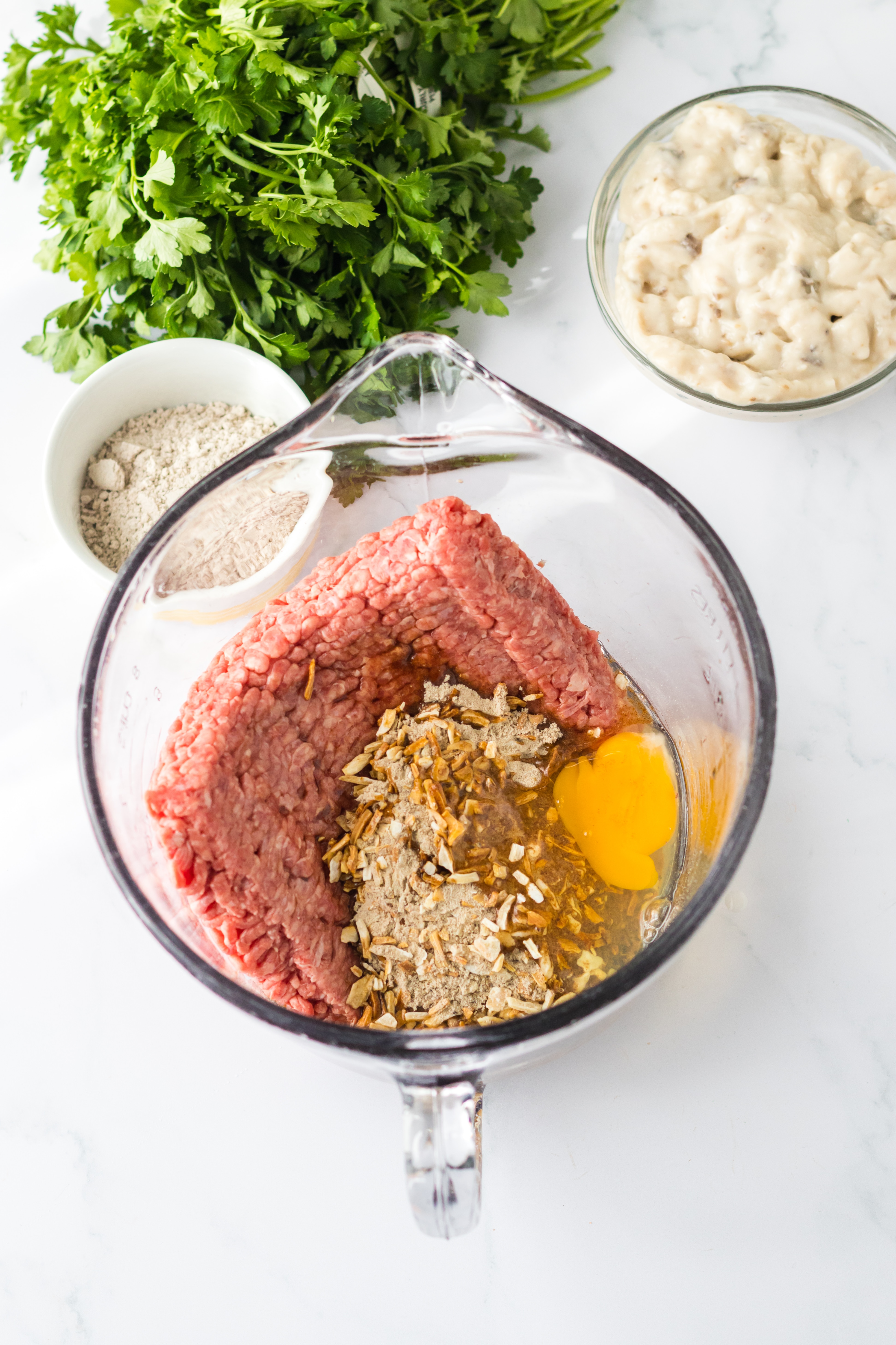 - In a large bowl combine the ground beef, onion soup mix, worcheshire sauce, steak seasoning, egg and bread crumbs.