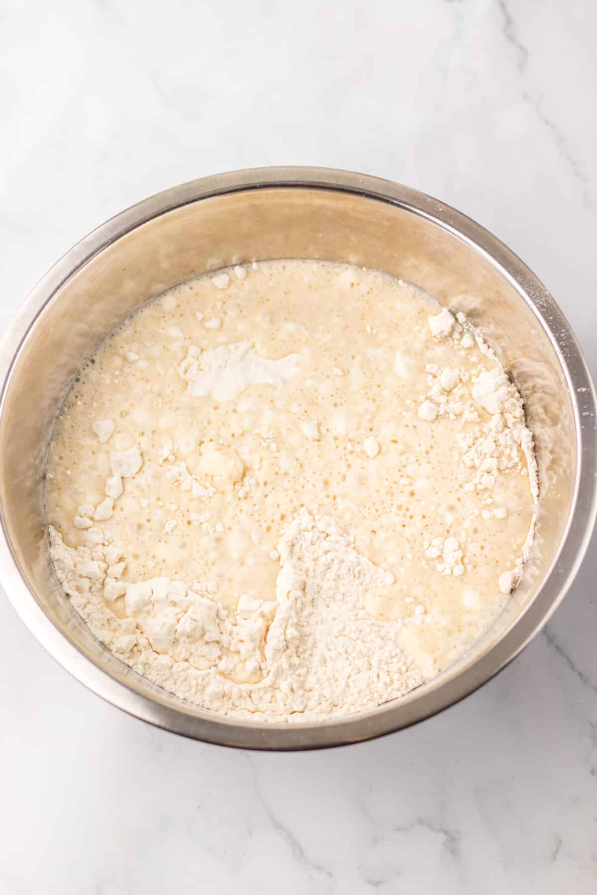 - To a large mixing bowl combine the salt and flour.