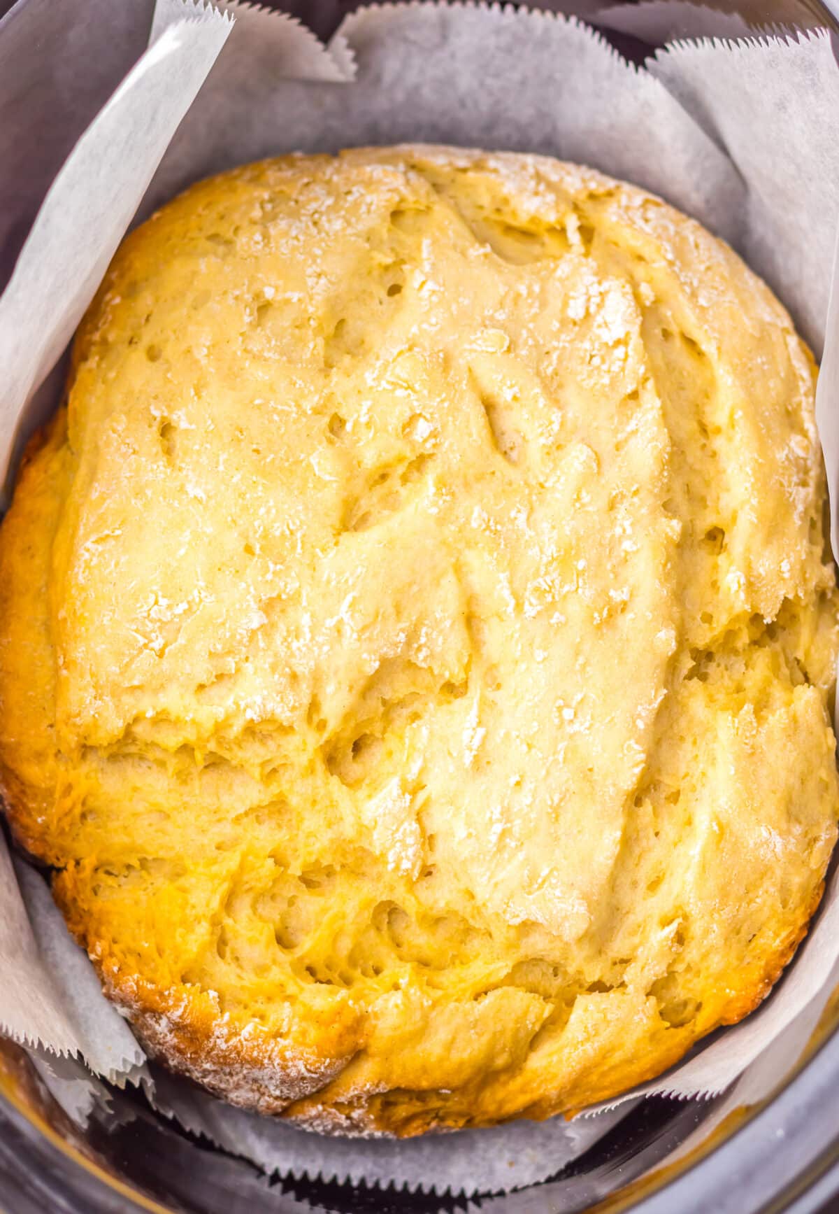 Cook in slow cooker: Line your slow cooker with parchment paper, place the dough inside, and cover. Cook on HIGH for 2 hours.