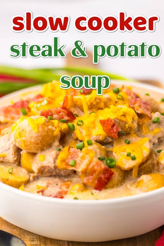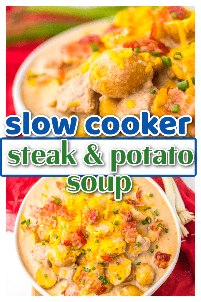 This Slow Cooker Eye Steak and Potato Soup is so delicious and hearty! Tender chunks of steak and potato slow cook all day in a flavorful stock. Heavy cream at the end makes this soup creamy. Then it gets topped with bacon, cheese and scallions making this soup loaded with flavor. Easy and delicious this is a great soup to warm you up.