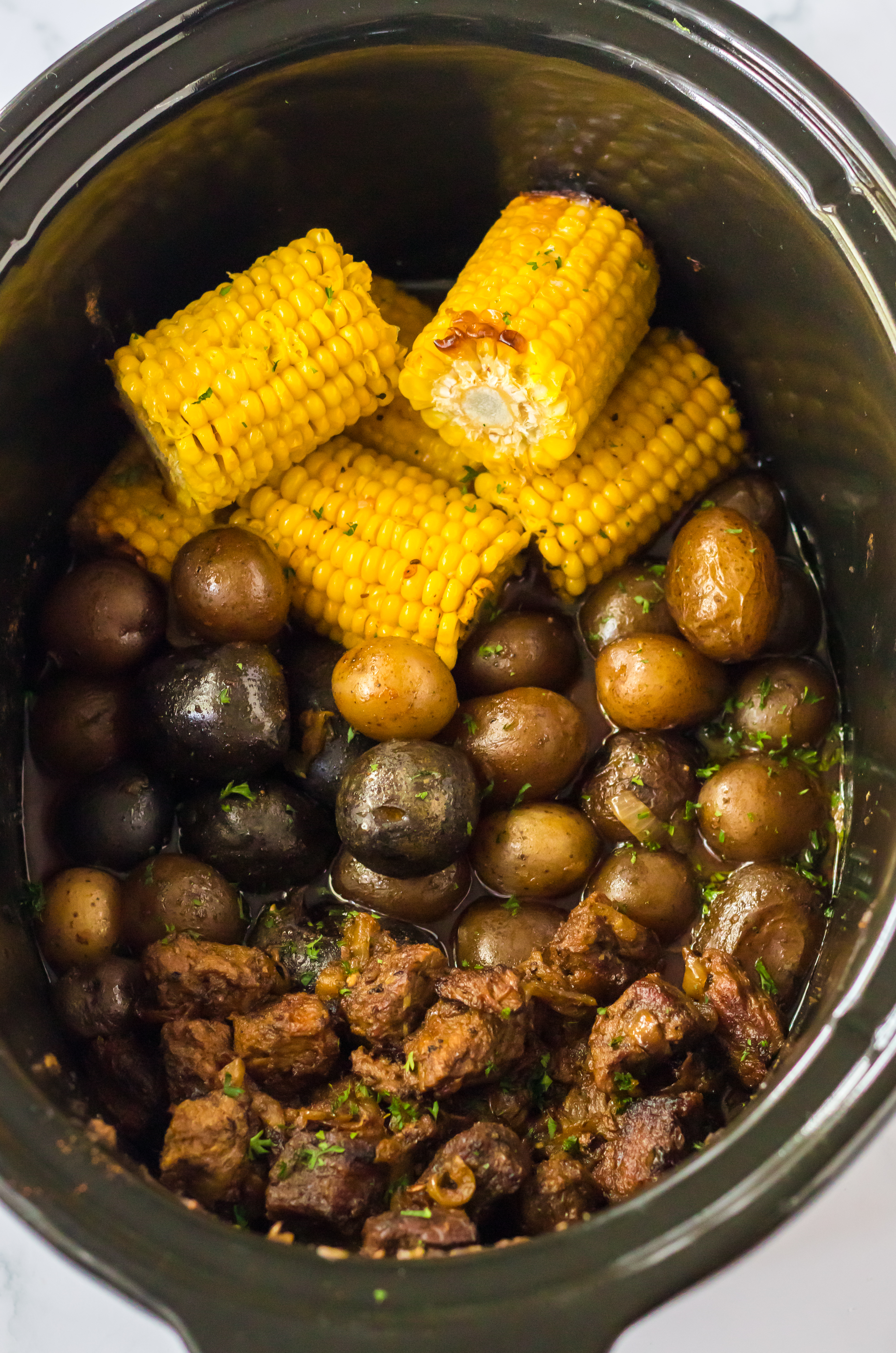Slow Cooker Steak, Potatoes, Corn