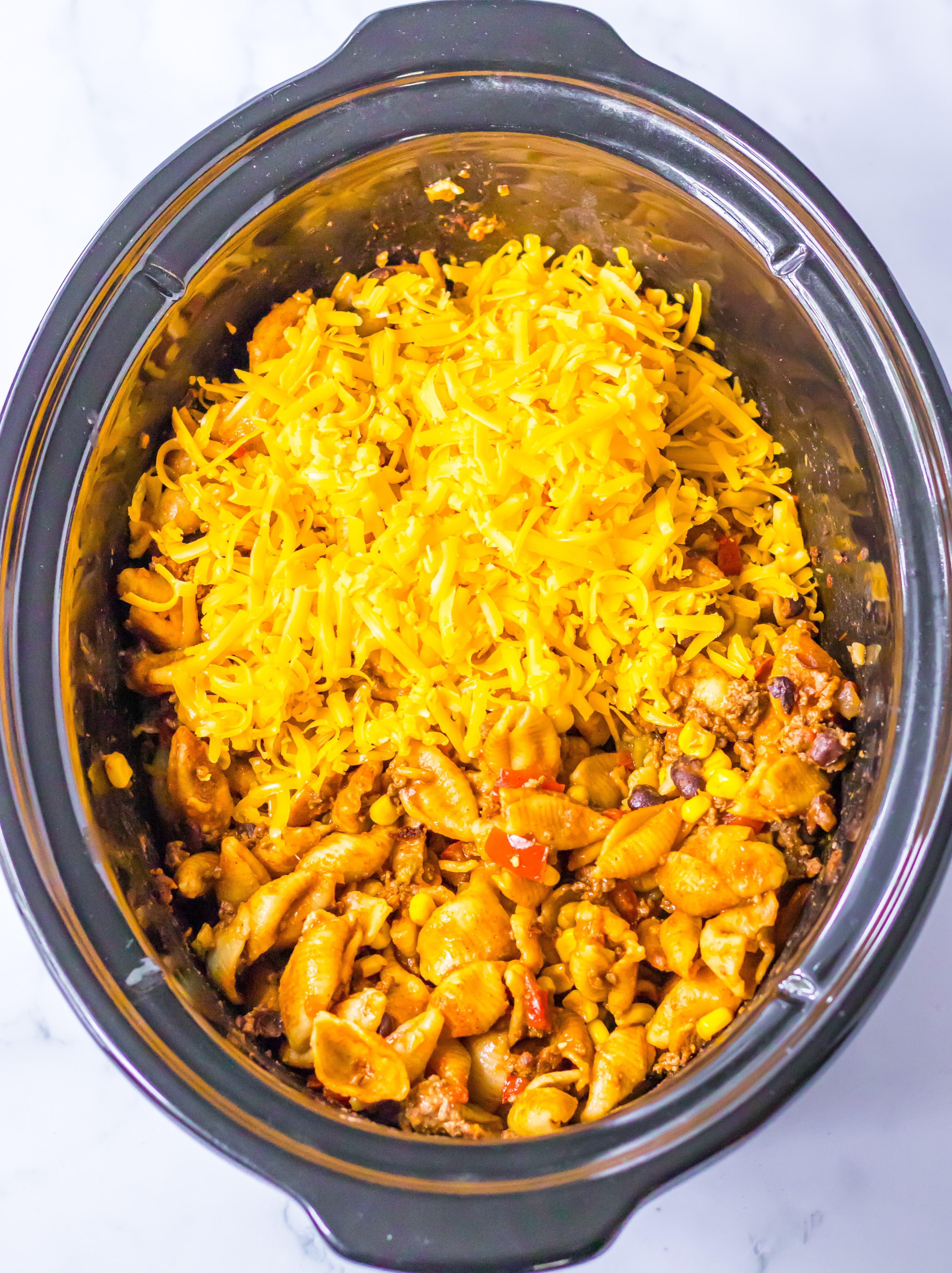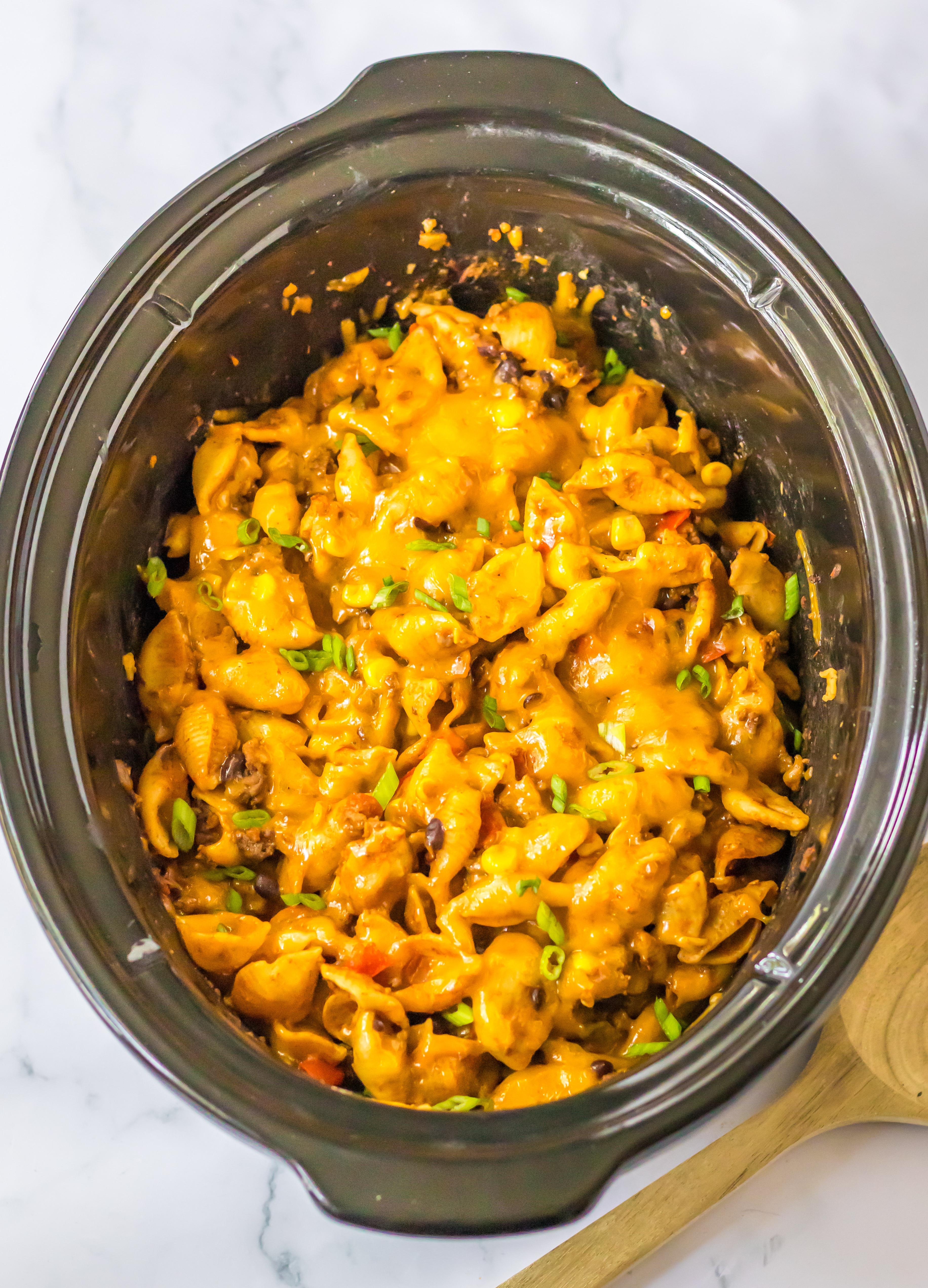 This starts with an easy flavorful taco meat that slow cooks all day with corn and black beans, then you stir in some noodles and cheese for the perfect taco pasta recipe.