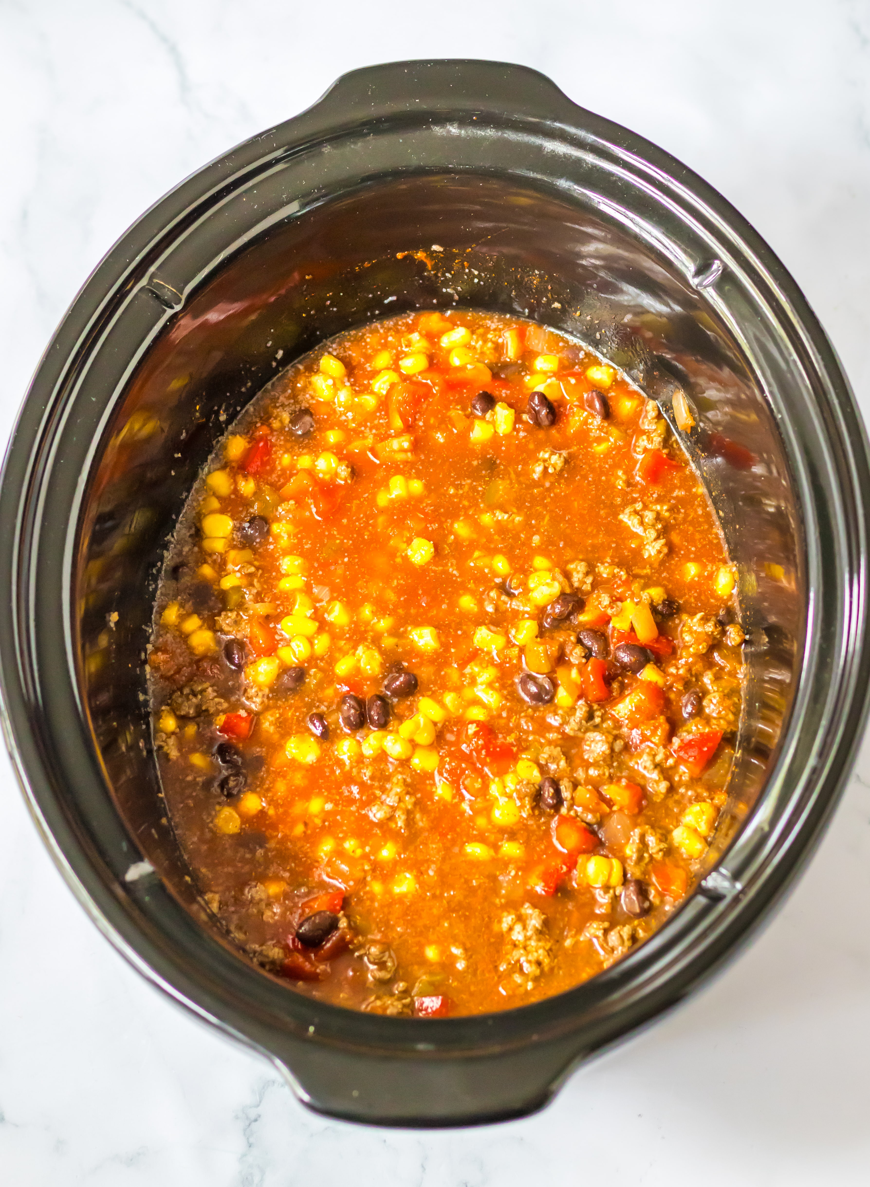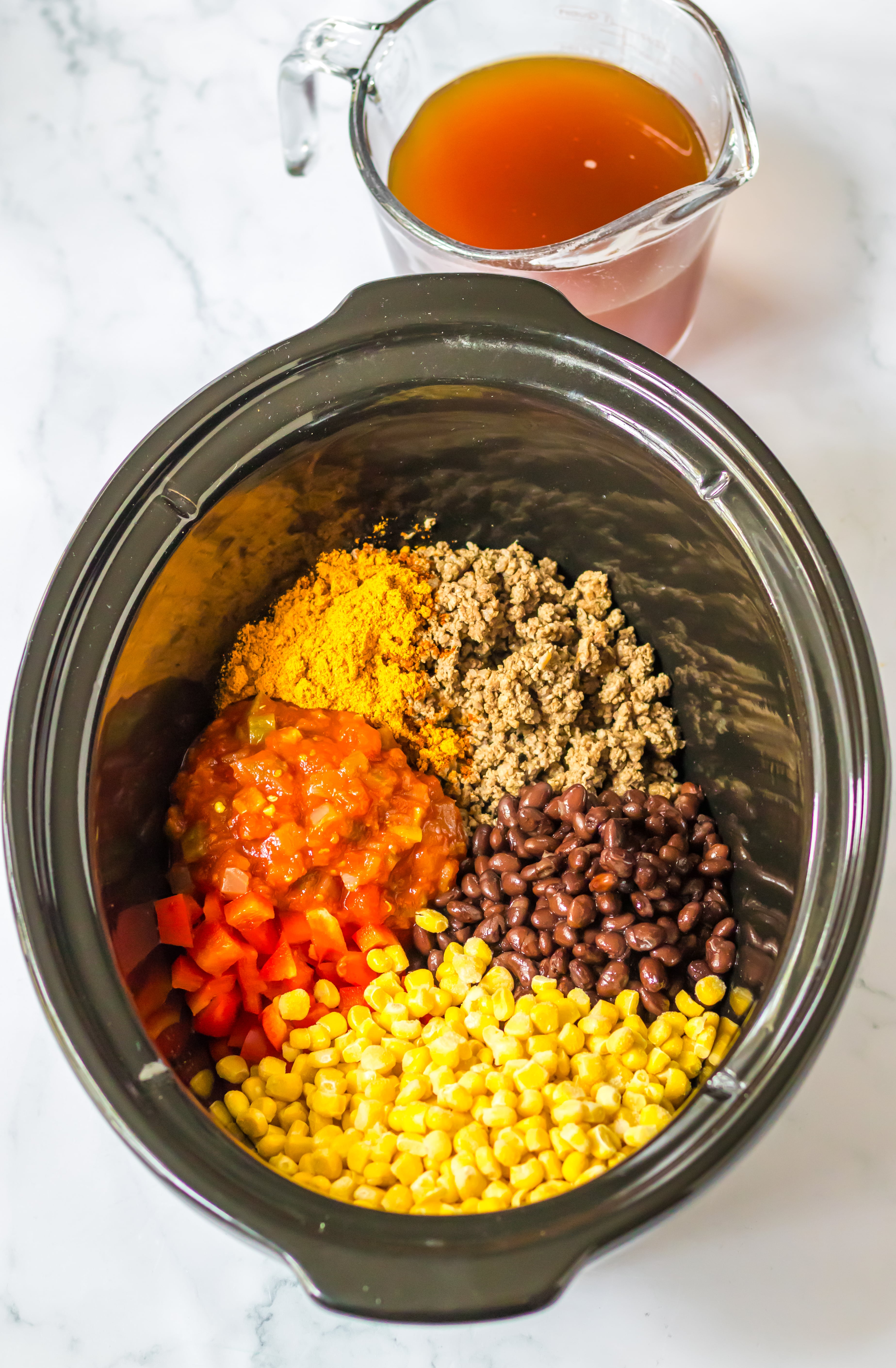- Add in your beef broth, salsa, frozen corn, beans, bell pepper and taco seasoning.