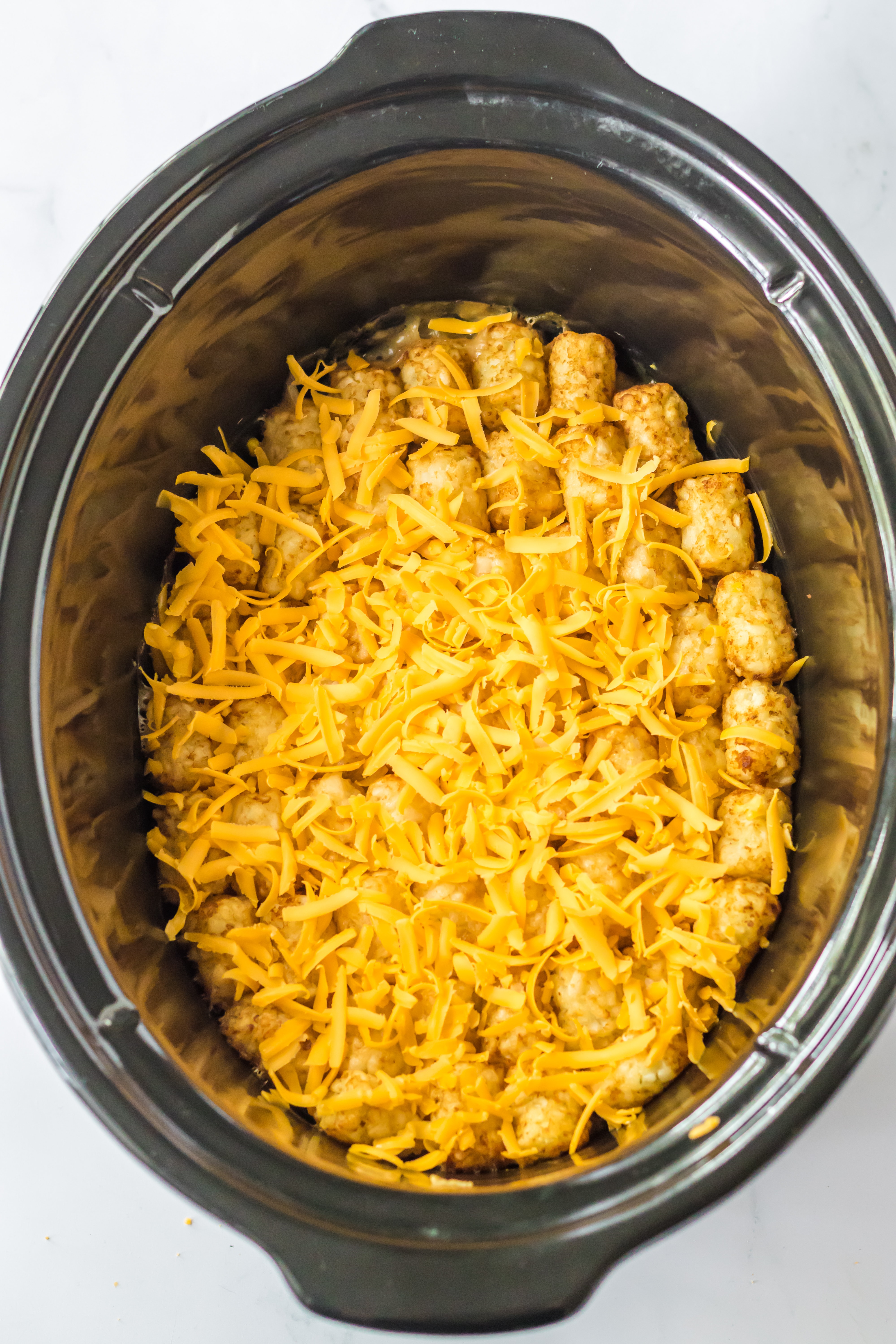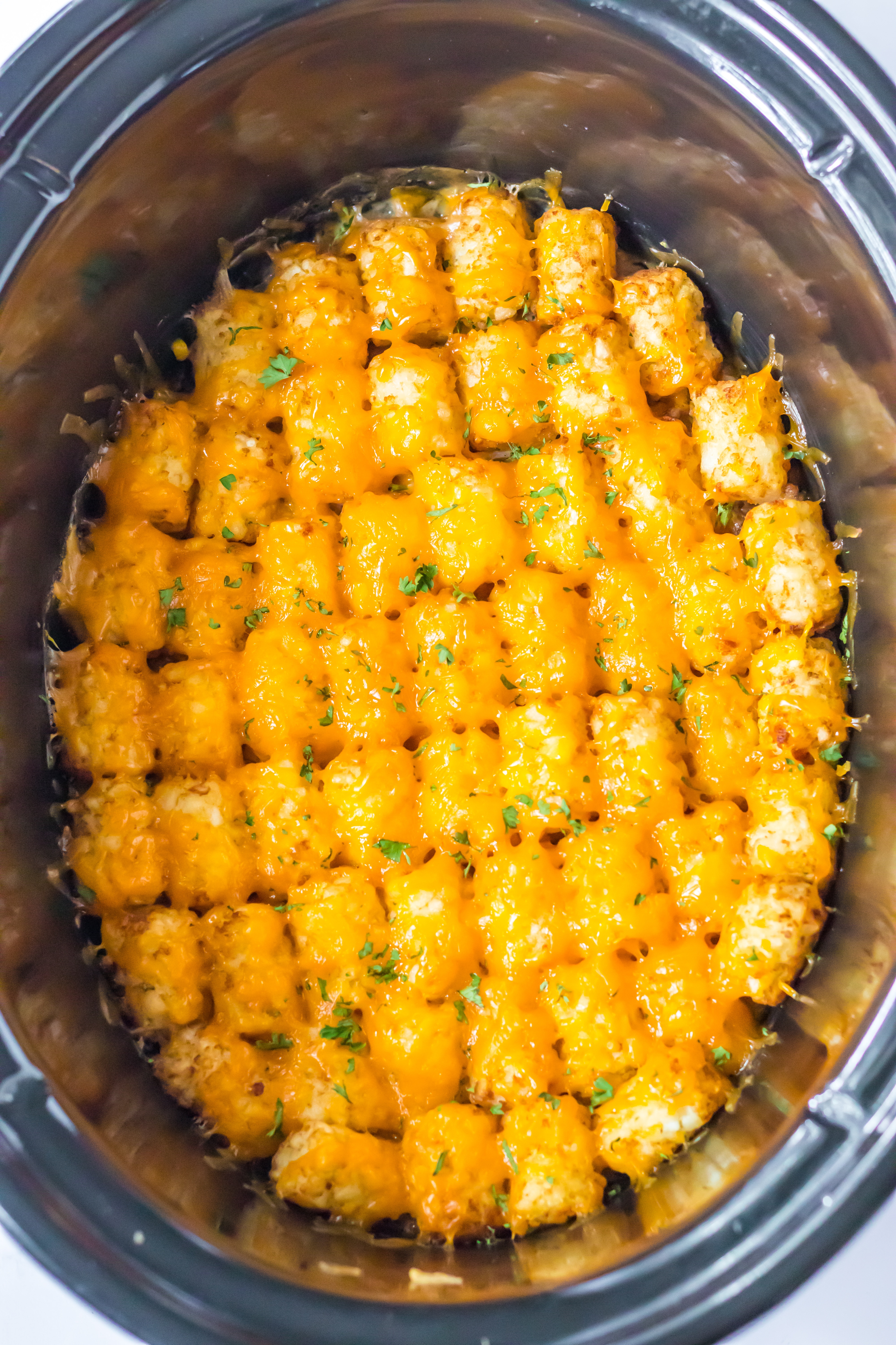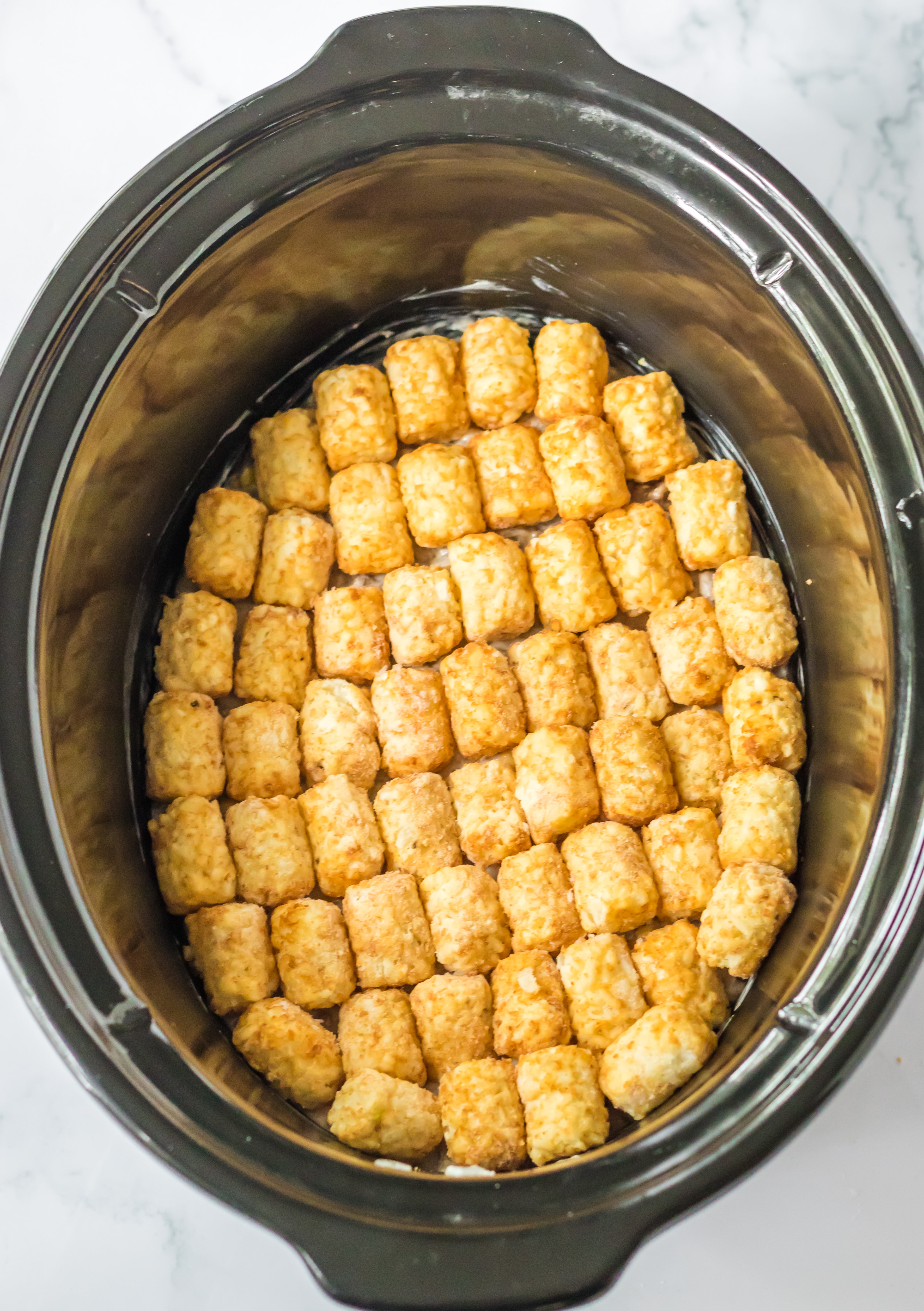 - Top with a single layer of tatertots.