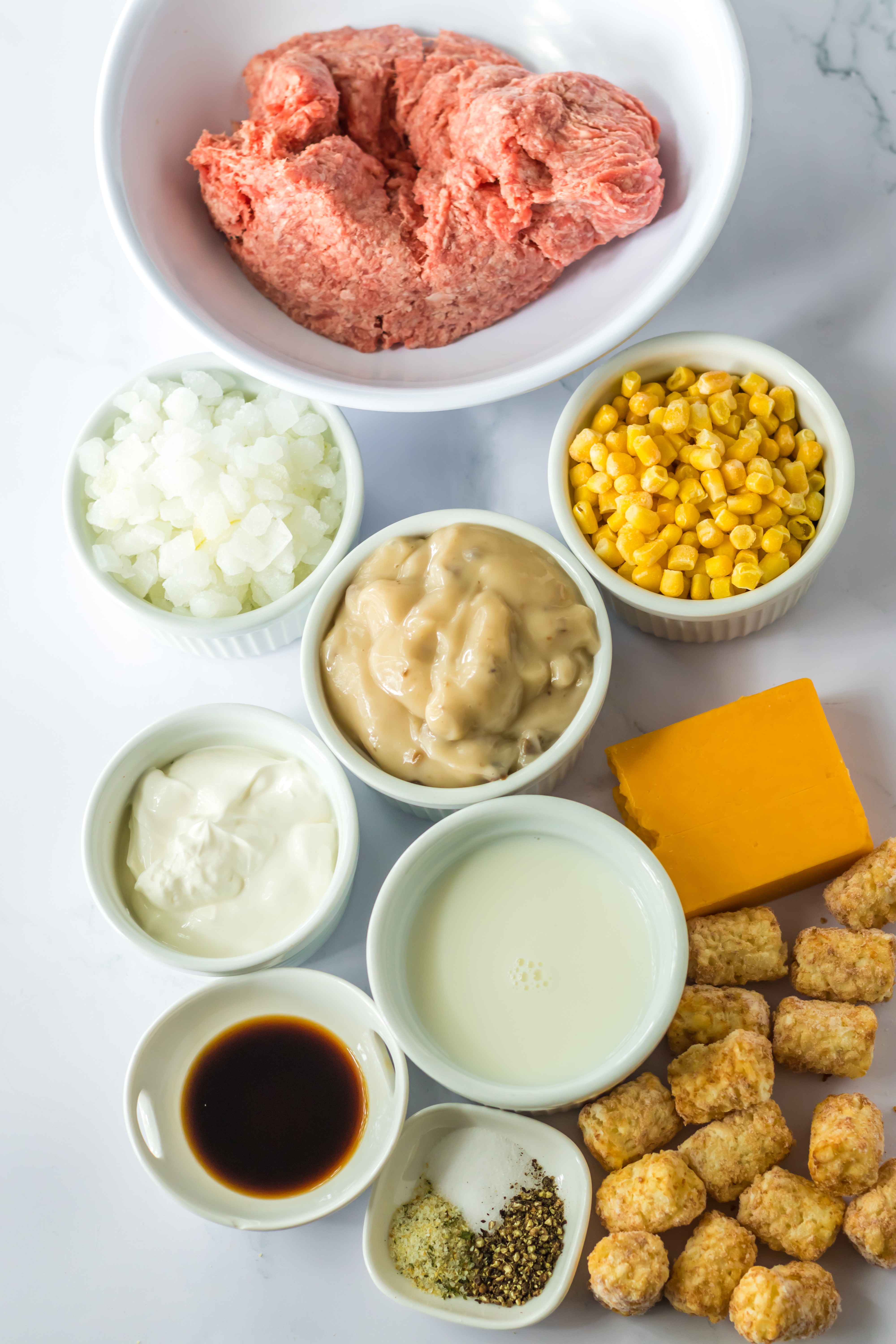 Ground beef, corn, onion, and cream of mushroom soup make up the base. It gets topped with tatertots and cheese and cooks to perfection.