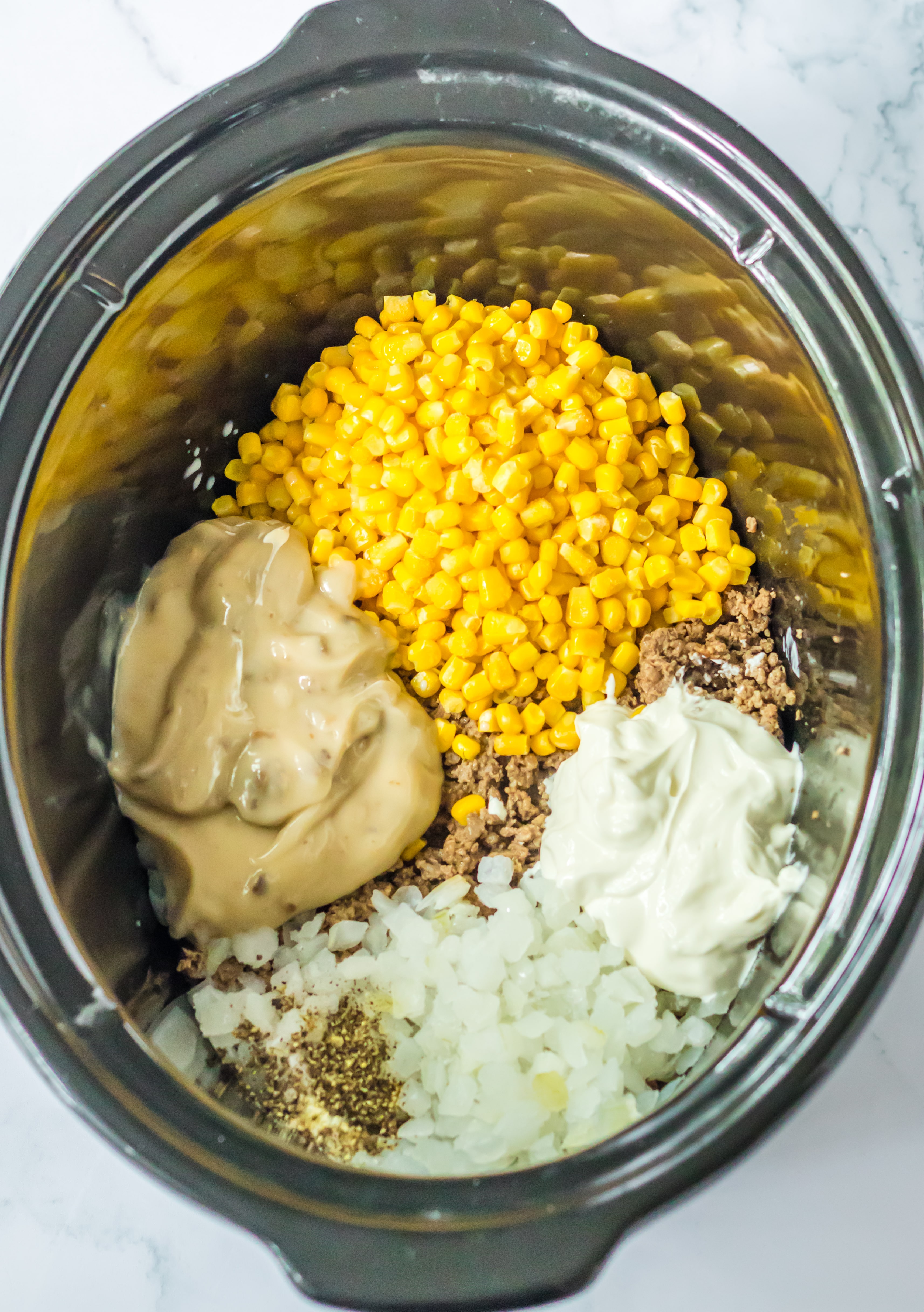 - To your slow cooker add the ground beef, onion, corn, cream of mushroom soup, milk, sour cream worcheshire sauce and seasonings.