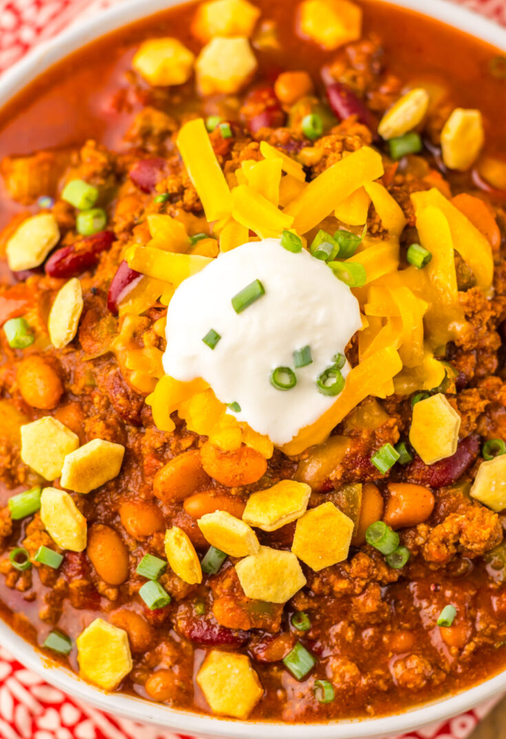 I love that you can customize this to your family’s taste, make it spicier, switch up the beans, add your favorite seasonings, add corn, you can totally make this recipe your own. You can also top this with anything you like. I like to just add scallions but you can top it with black olives, jalapenos, cilantro, sour cream or avocado. This hearty slow cooker chili is truly a comfort food. I love to serve it with some easy homemade cornbread or baked potatoes. It is also great with saltine crackers or oyster crackers. The leftover chili is amazing the next day.