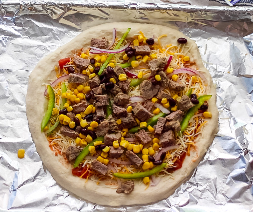 We topped this Steak Fajita Pizza with salsa as the sauce, Colby Jack cheese, green pepper and red onion, grilled steak pieces (a great way to use up leftovers), and corn and black beans.