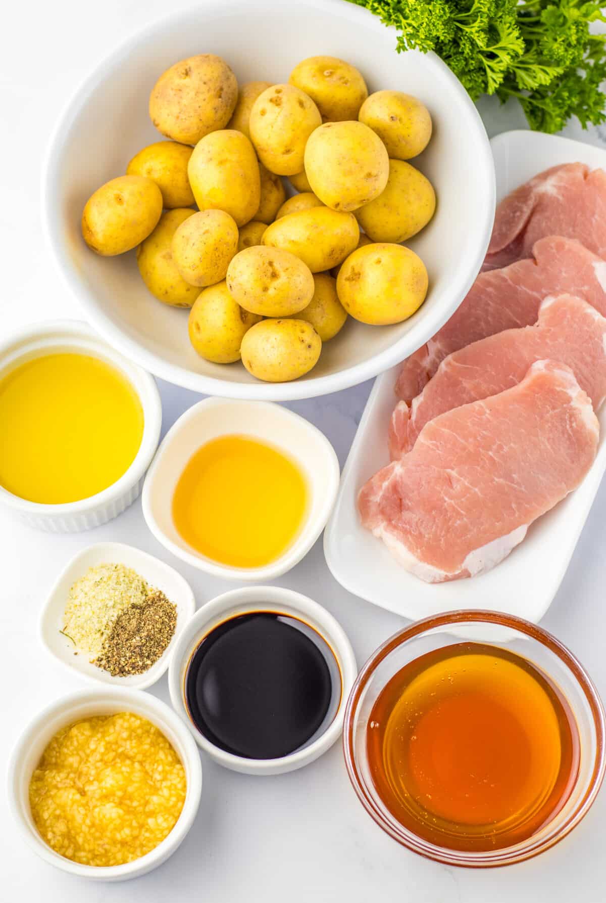 I usually go for ¾-inch thick chops so they stay juicy. Thin ones work too, just adjust the cooking time.1 pound baby potatoes, halved