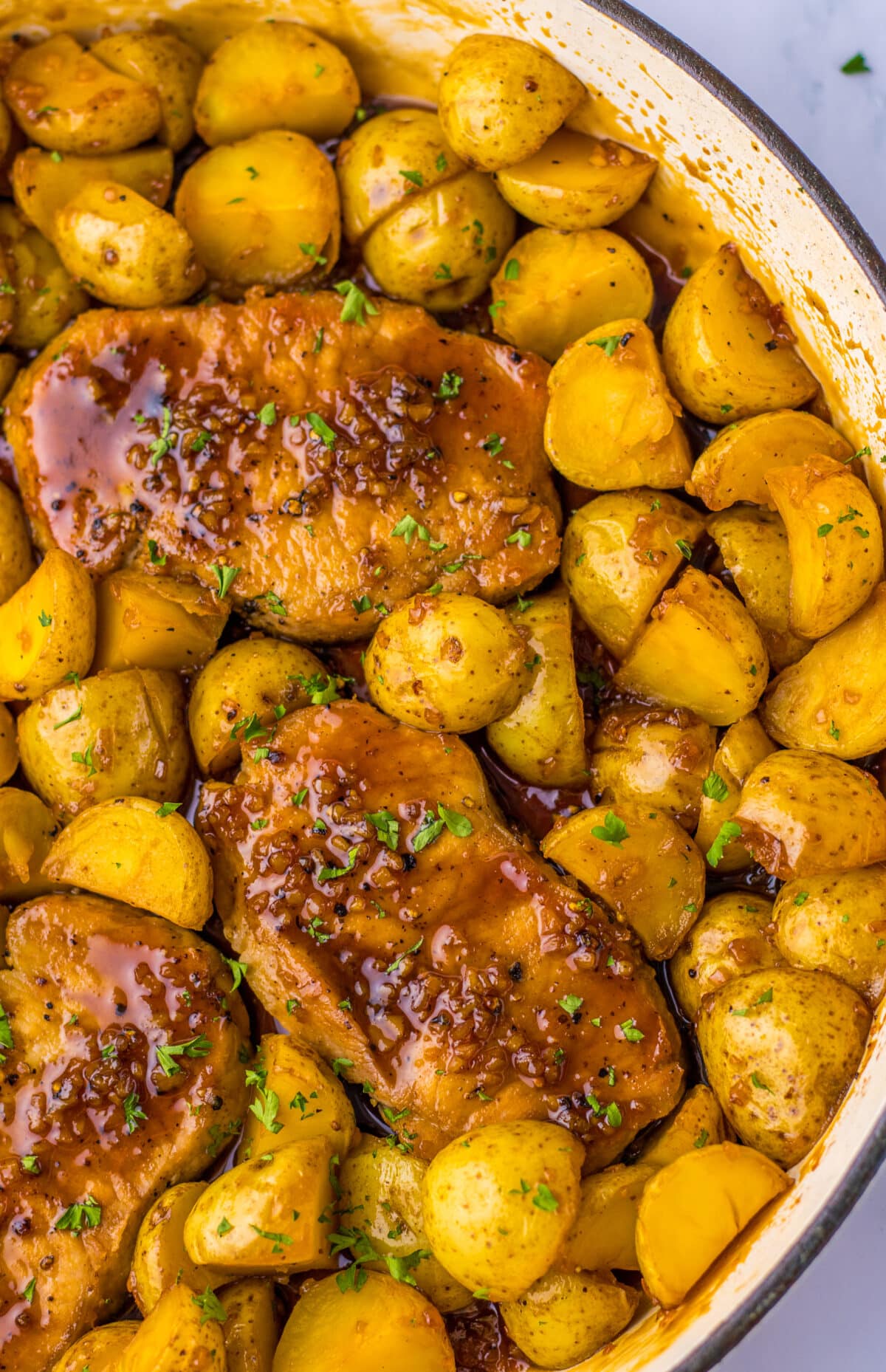Toss the boiled potatoes into the glaze and stir gently to coat. Add the pork chops back into the pan and spoon the sauce over everything. Let it cook for another minute or two to warm everything through and let the flavors meld.