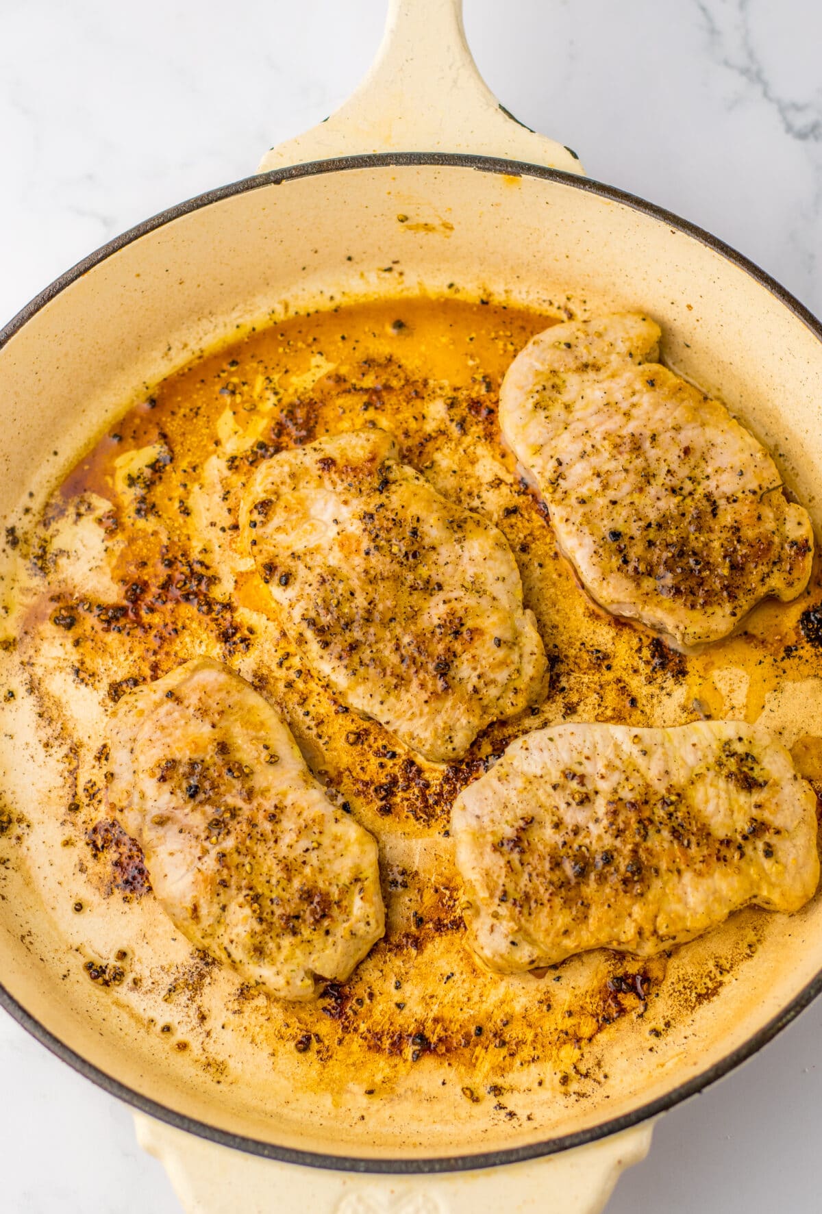 Heat a big skillet over medium-high heat and add a little butter or oil. Once hot, sear your pork chops for 4–6 minutes per side, depending on thickness. You want a nice golden crust and an internal temp of 145°F. Remove them and set aside.