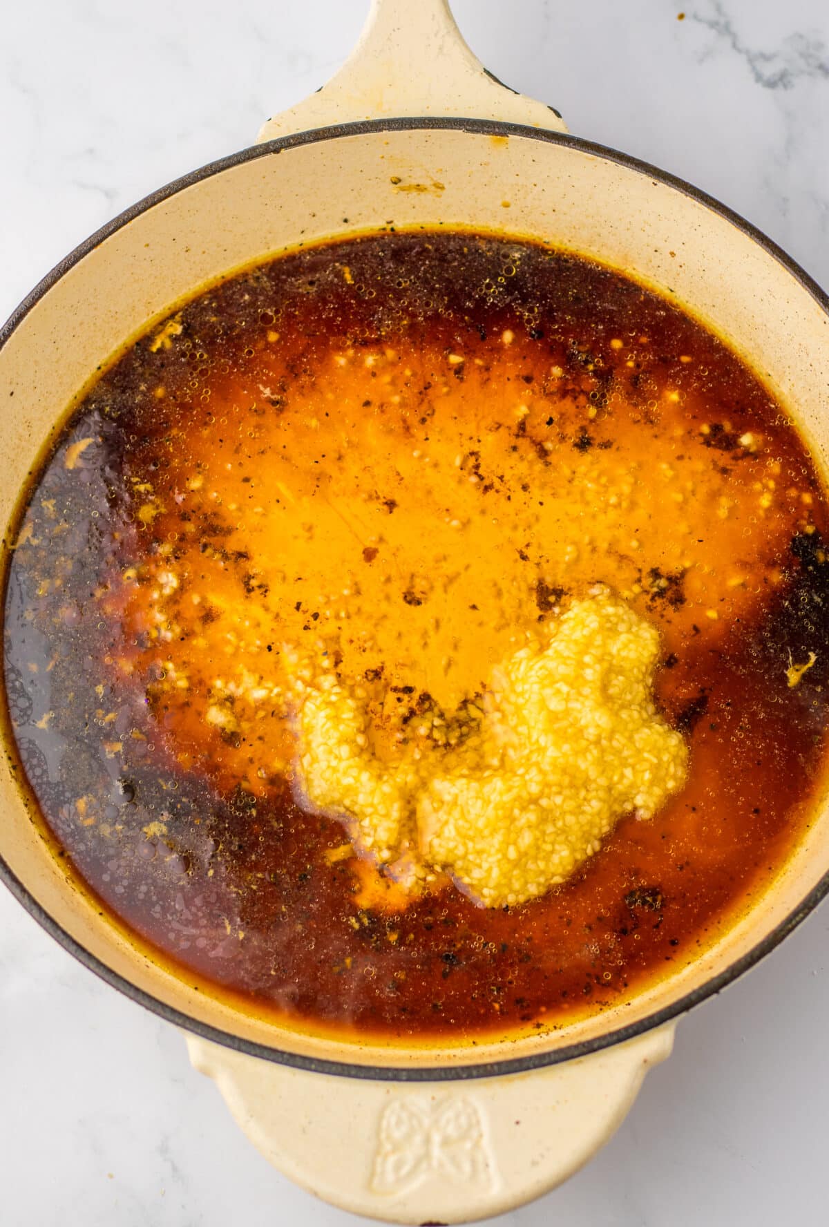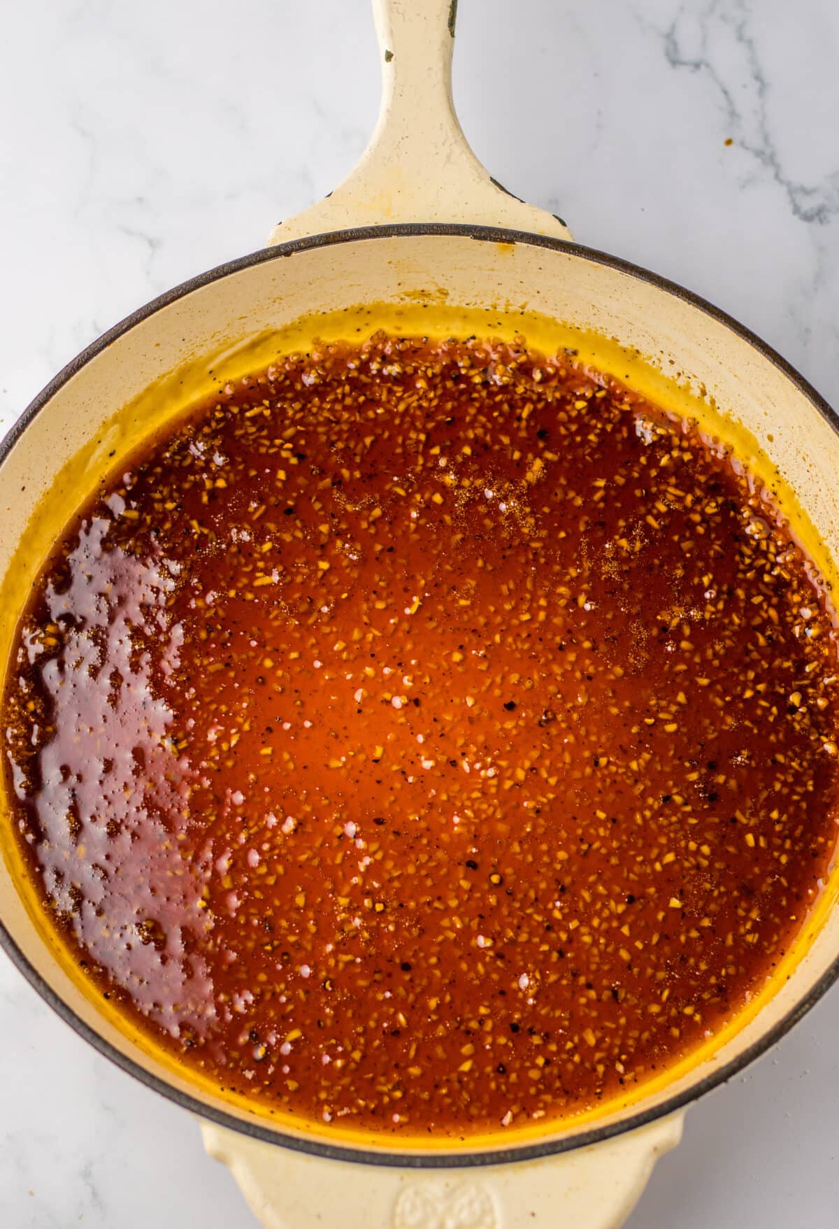 In that same skillet (don’t clean it out, you want all that flavor), add the garlic, honey, chicken stock, vinegar, and soy sauce. Whisk it all together and let it simmer for 5–8 minutes, until it reduces and thickens a bit.