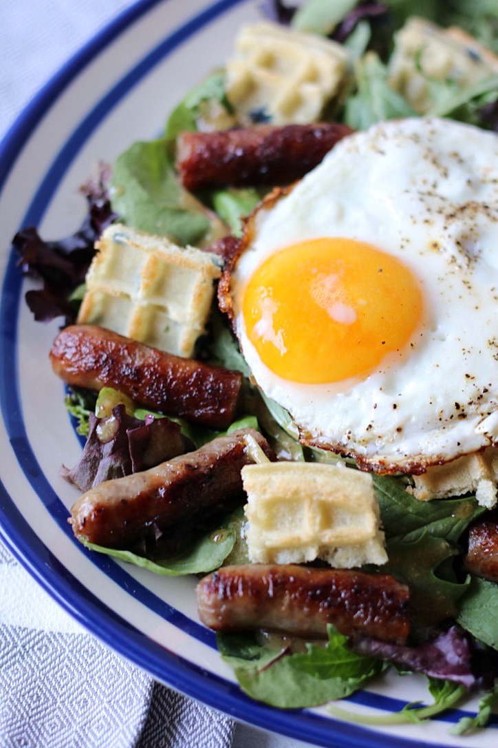 - Top the lettuce with the sausage, waffle croutons and a fried egg.