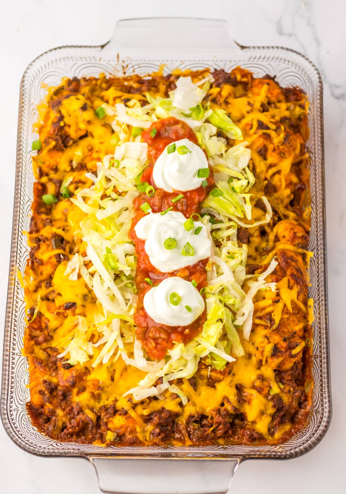 This recipe is pure comfort food. Imagine juicy ground beef seasoned with taco spices, mixed with enchilada sauce and salsa, then tossed with biscuit dough and baked until everything is hot, cheesy, and bubbling. The biscuits rise and puff up around the beef mixture, soaking in all that saucy, taco flavor. Every bite is hearty and satisfying, and the best part is you can pile on your favorite taco toppings at the end, sour cream, shredded lettuce, diced tomatoes, more salsa, anything goes.