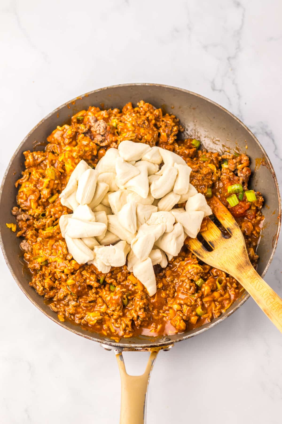 Add biscuits – Cut each biscuit into 8 pieces and gently stir them into the beef mixture.