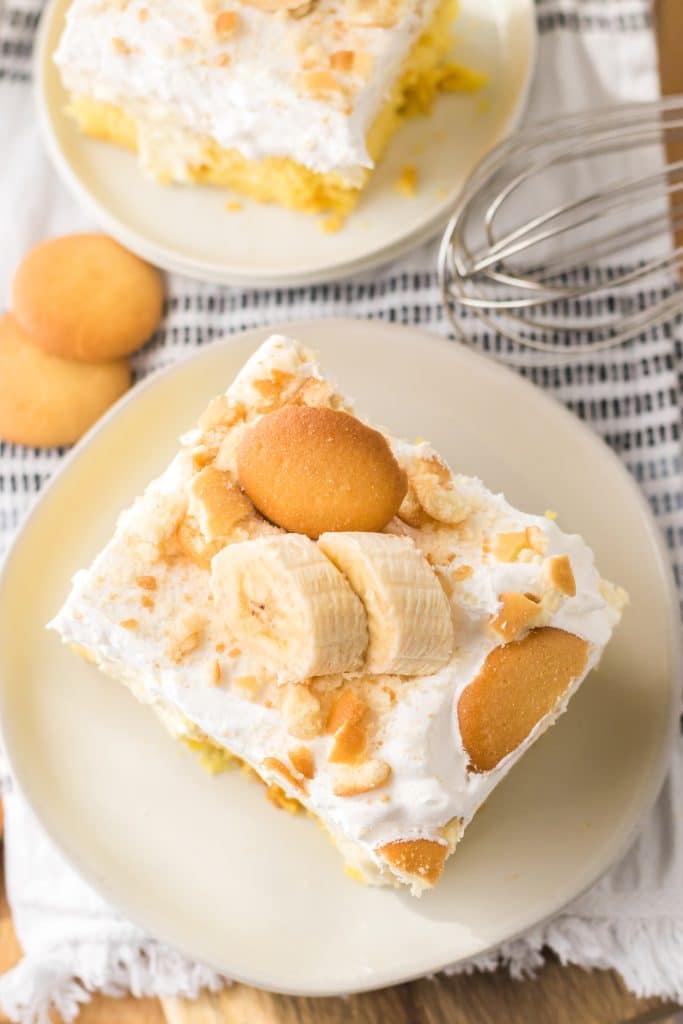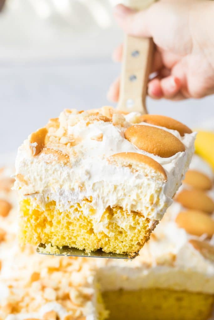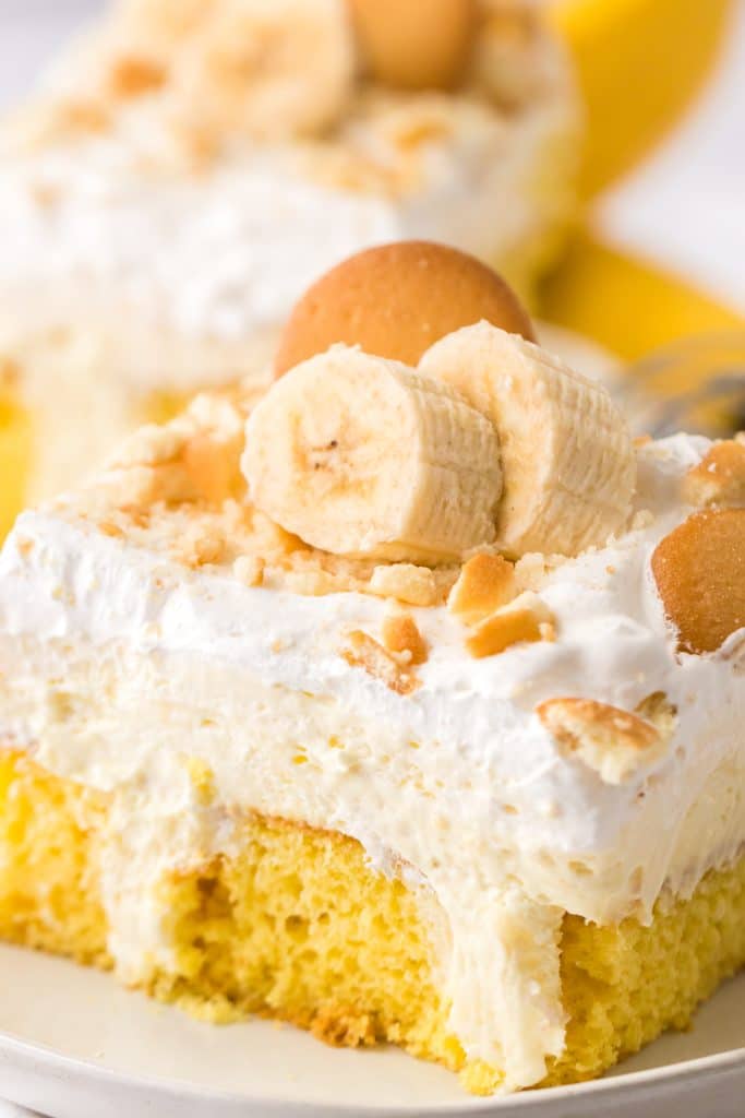 This banana pudding version is a delicious spin on classic banana pudding and poke cakes. Yellow cake gets filled with a delicious creamy filling of cream cheese, sweetened condensed milk, banana pudding and whipped topping. This is truly an ultimate version of banana pudding and poke cake. Topped with a crushed vanilla wafers and fresh bananas this is a great spin on a classic.