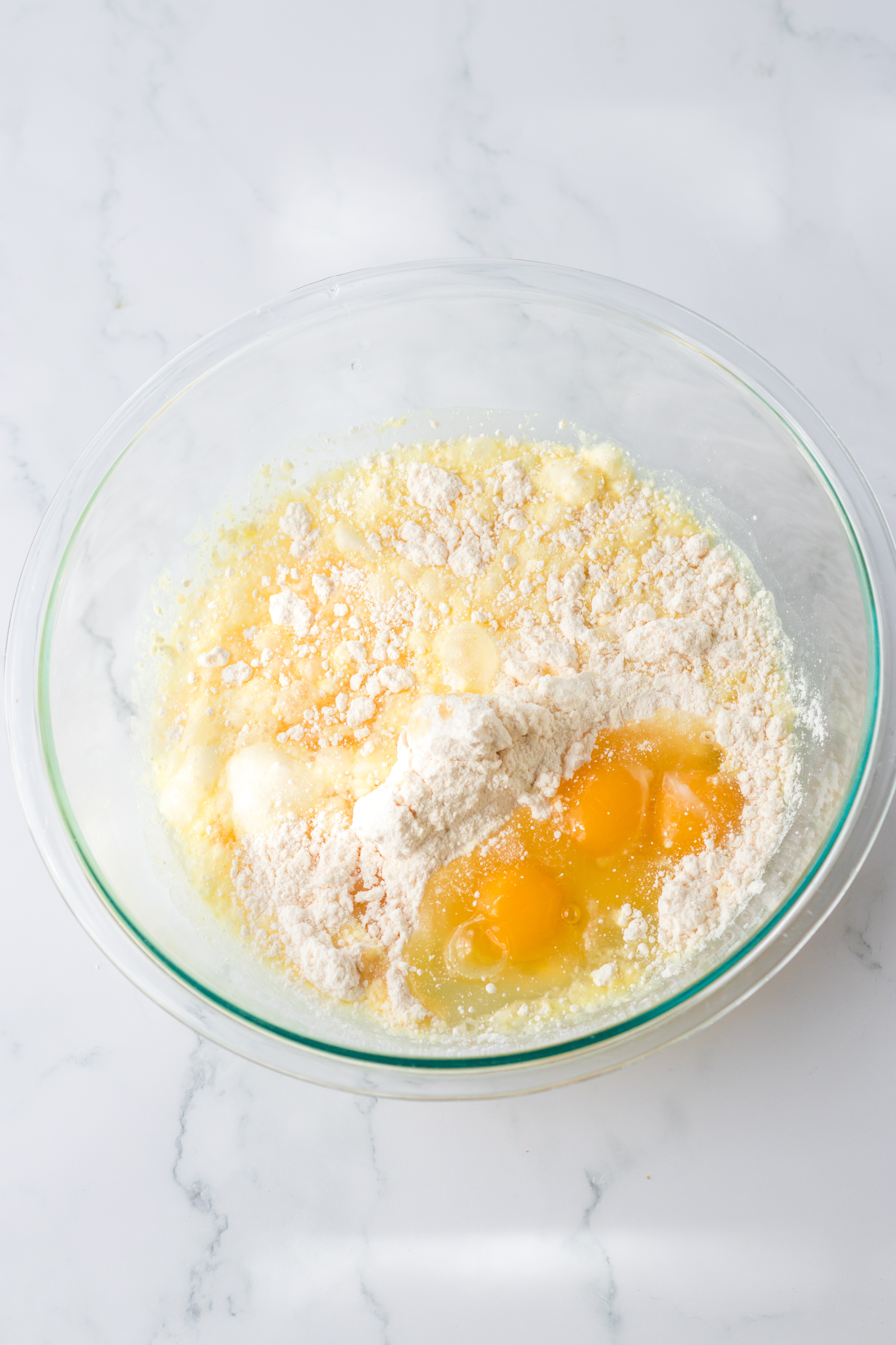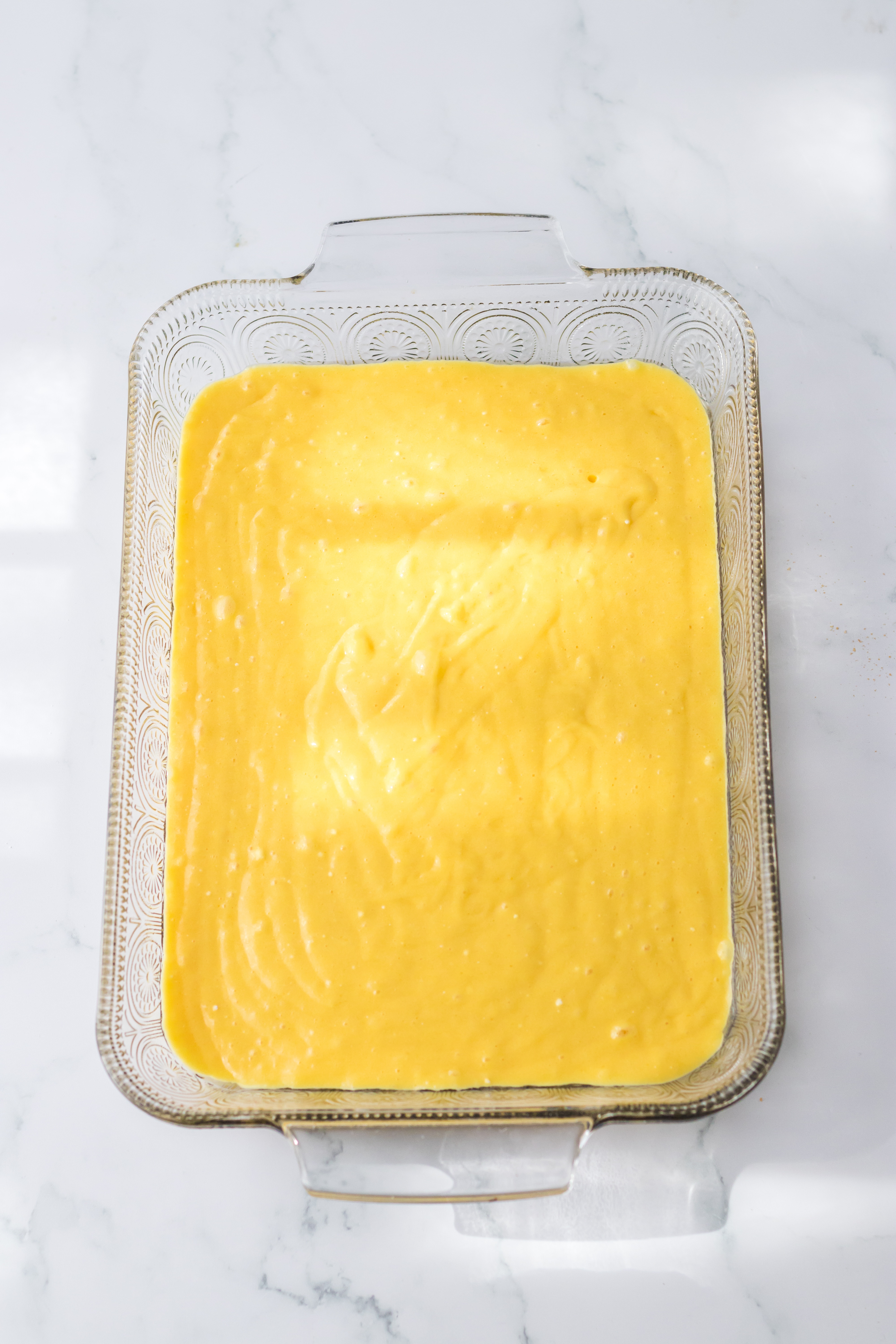 - Prepare the cake mix as directed on the box and pour into a greased 9×13 baking dish.