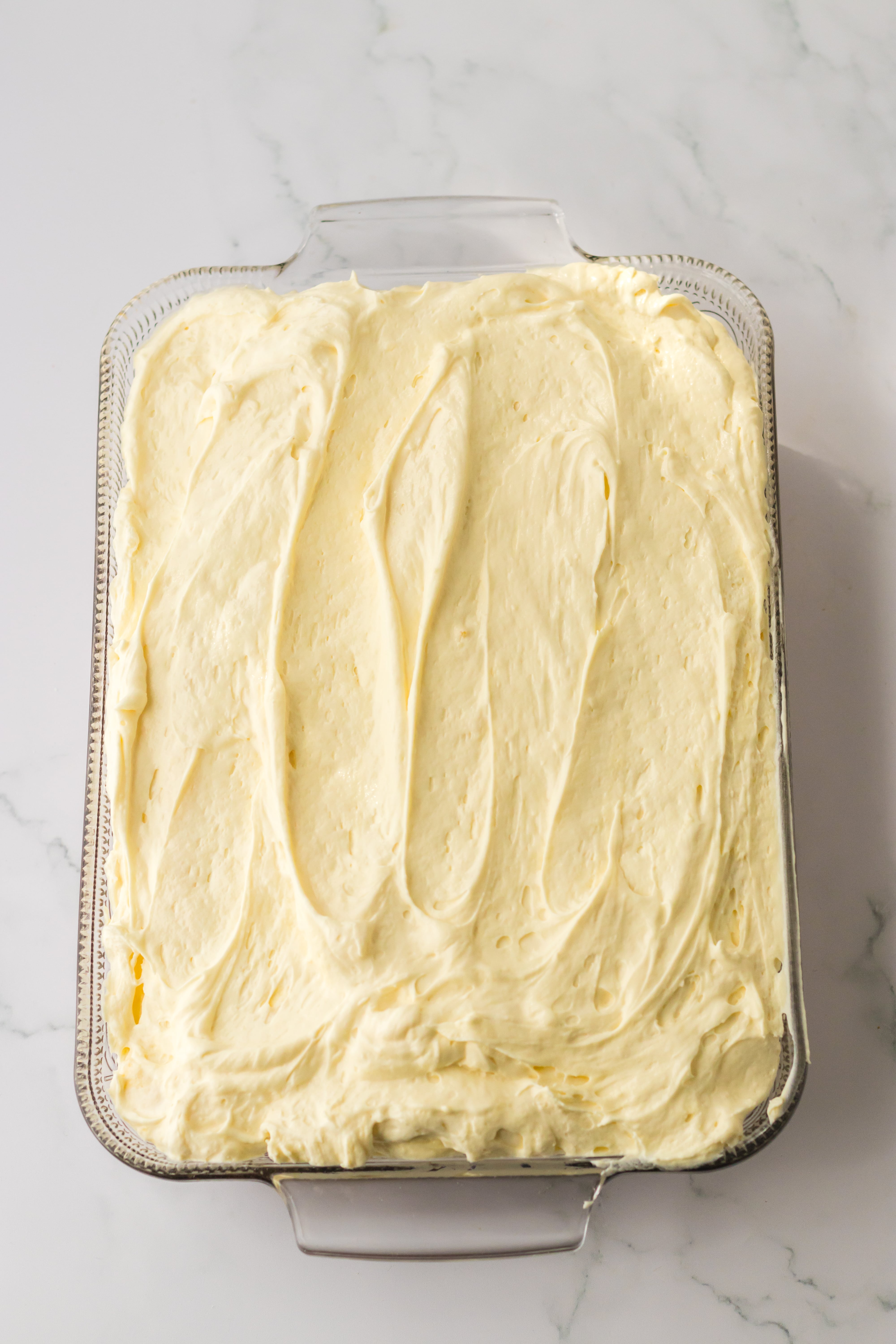 - Spoon the banana pudding mix on top of the cake making sure it gets down into the holes.