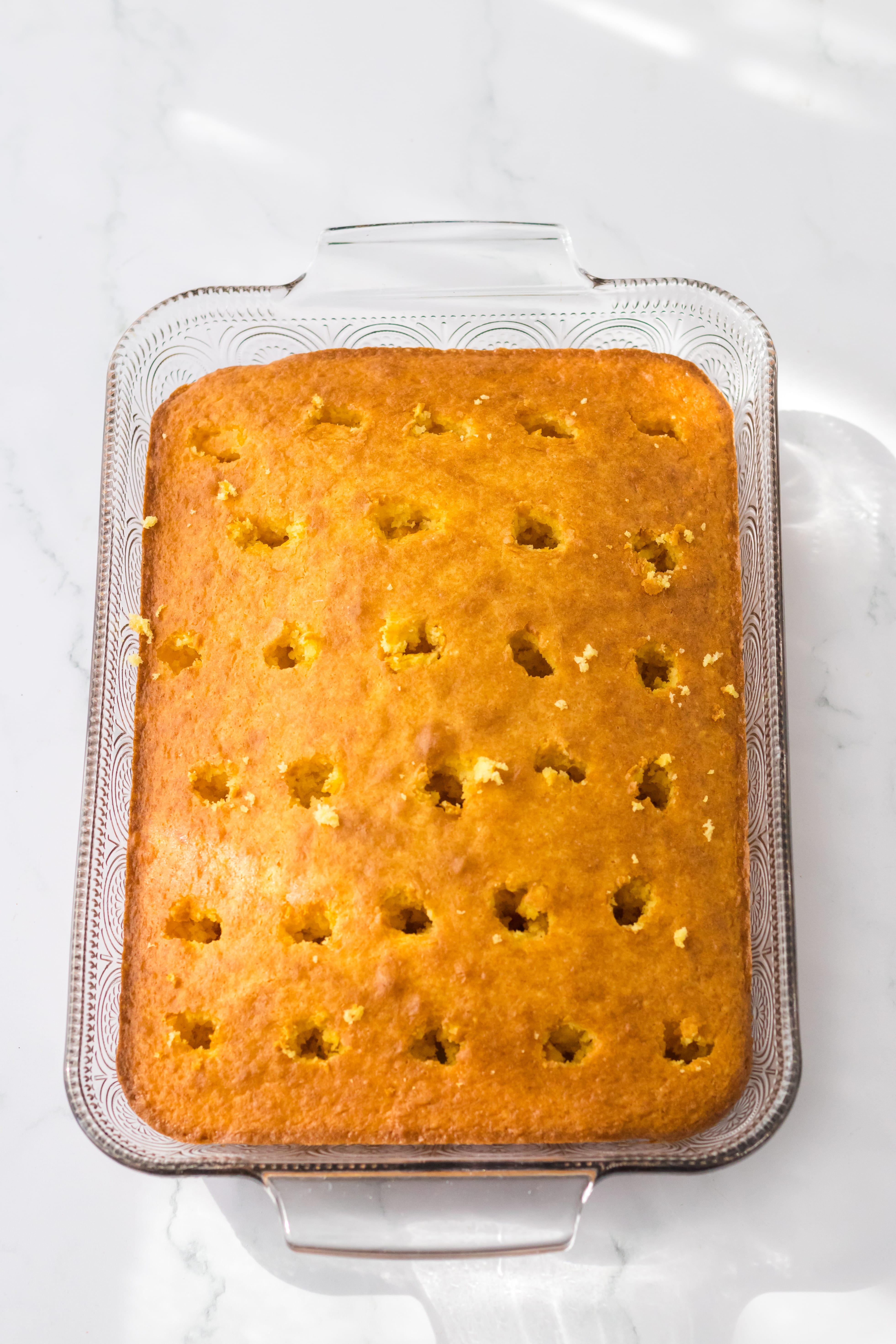 - Using the end of a wooden spoon poke hole all over your cake. You want to make the holes fairly large so the filling can get down into them.
