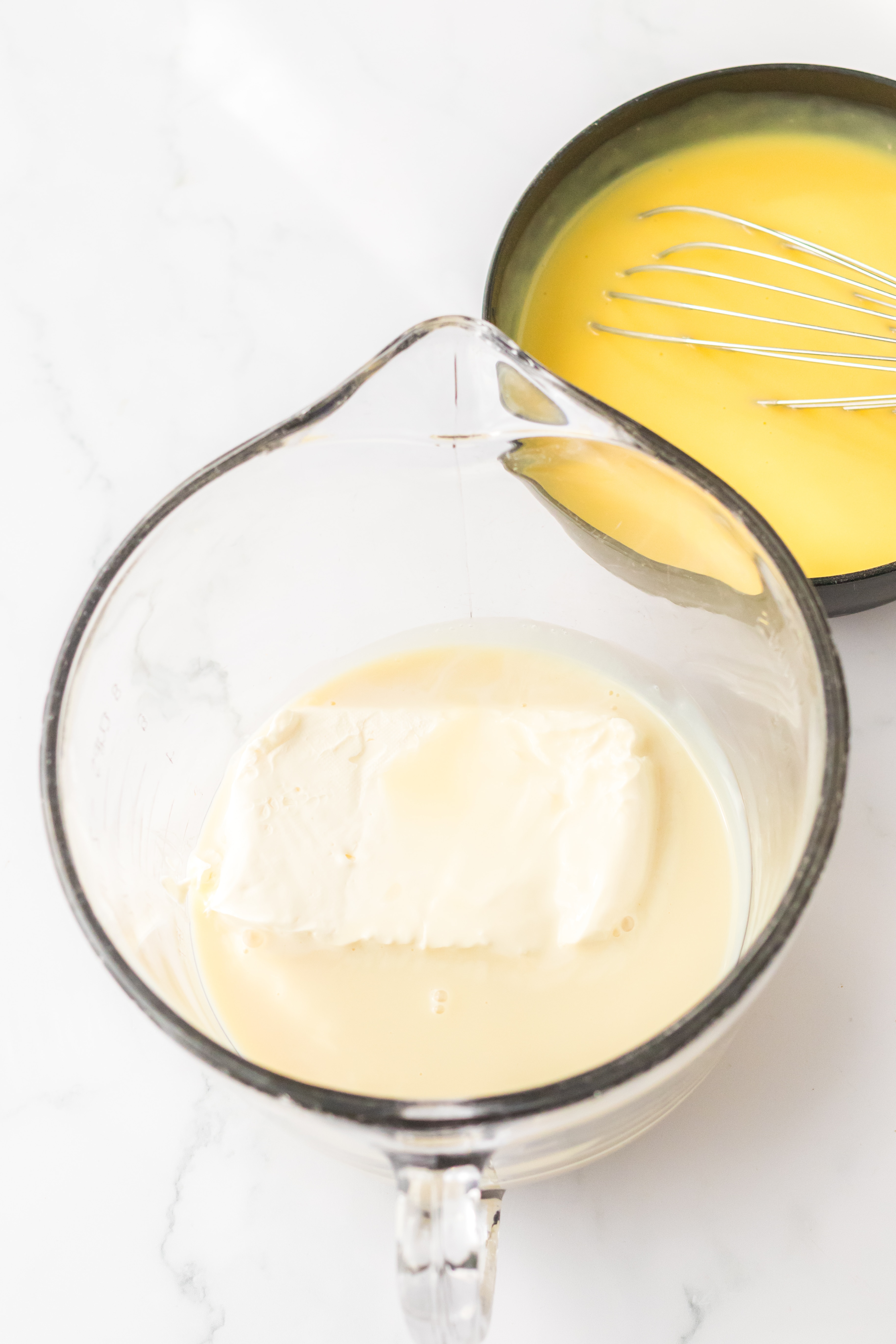- In a mixing bowl whip together the softened cream cheese and sweetened condensed milk.
